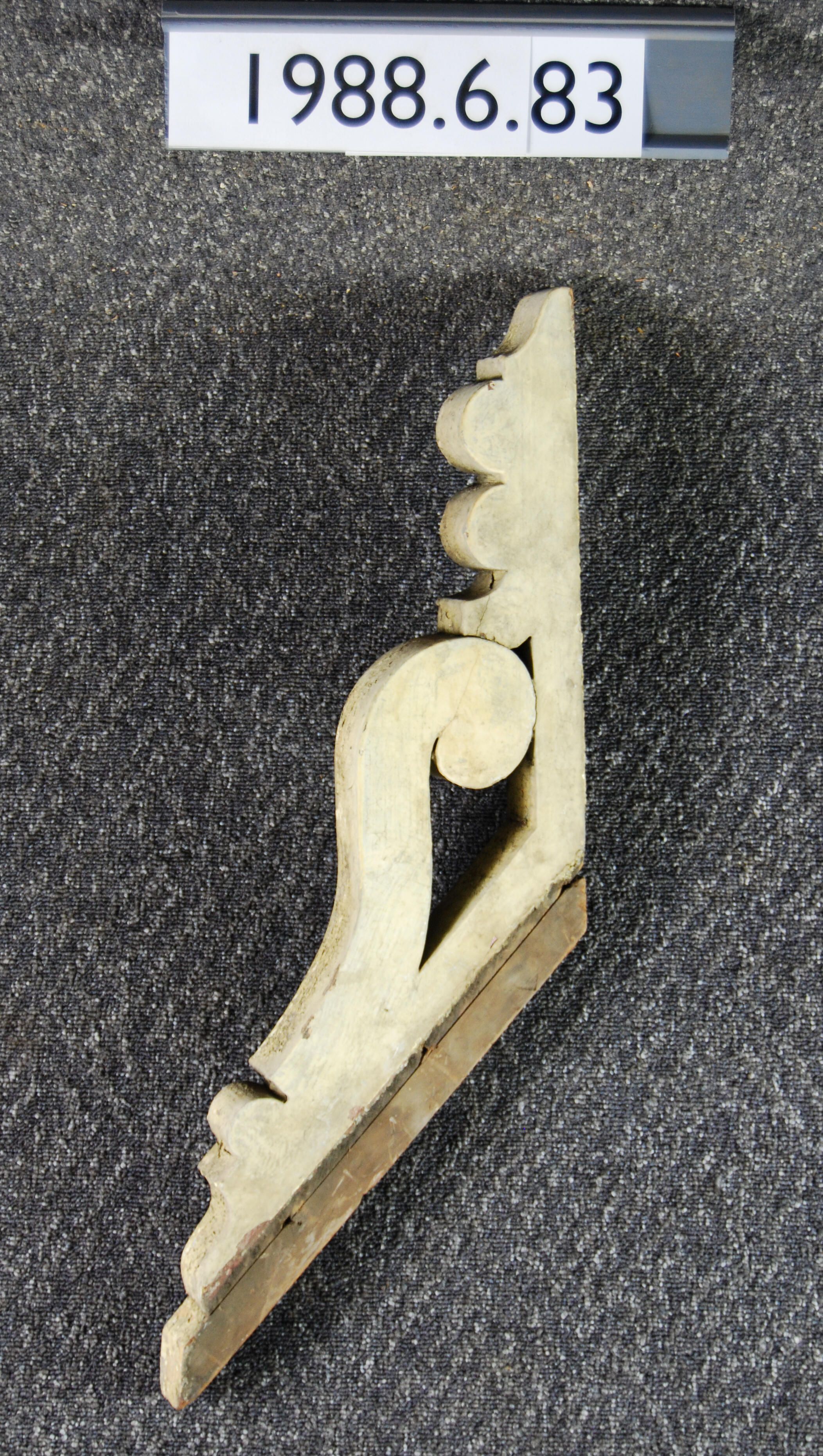 Wood cornice bracket. Angular top with attached cleat. Scrolled sides. Painted yellow. Inscriptions or Markings: Manufacturer: Place of Manufacturer: Design motif: Style: Finish: Painted