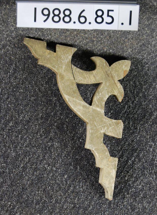 Wood bracket. Cut with fret saw from single piece of wood. Scroll / fleur-de-lis variation. Painted yellow. Inscriptions or Markings: Manufacturer: Place of Manufacturer: Design motif: Style: Finish: Painted