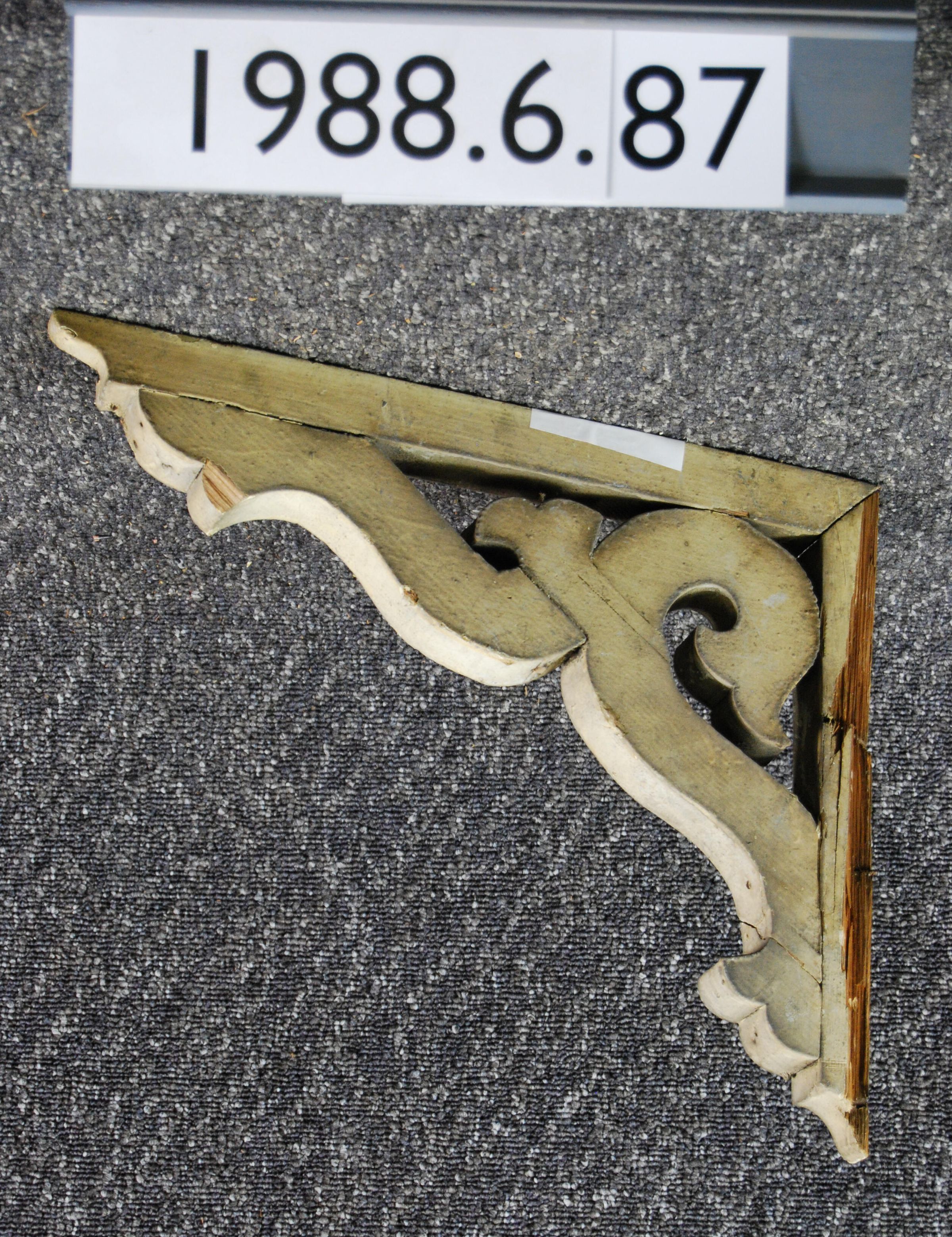 Wood bracket. Composed of multiple parts nailed together. Scrolled sides. Painted yellow. Inscriptions or Markings: Manufacturer: Place of Manufacturer: Design motif: Style: Finish: Painted