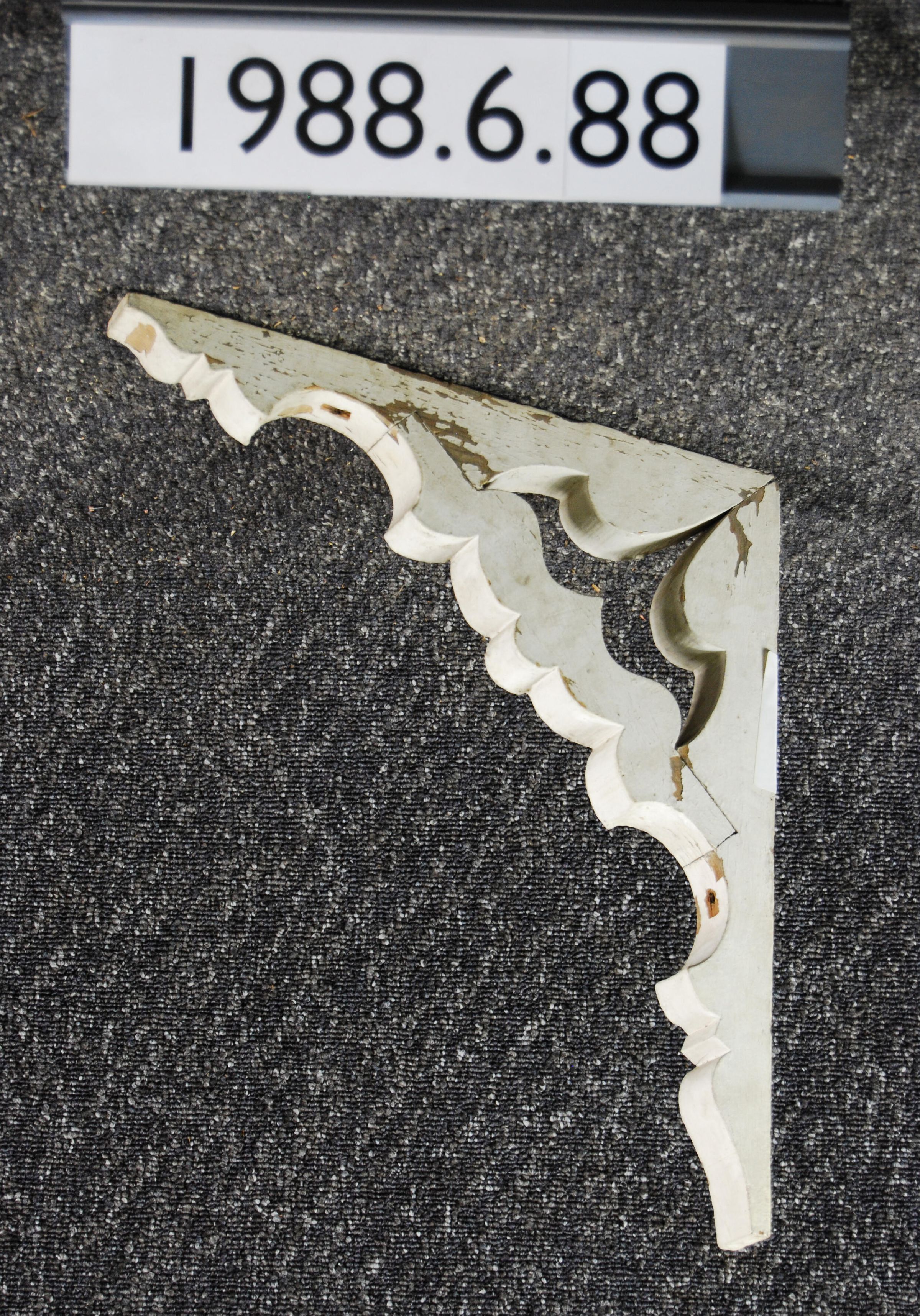 Wood bracket. Composed of multiple parts nailed together. Scrolled / fret cut sides. Painted white. Inscriptions or Markings: Manufacturer: Place of Manufacturer: Design motif: Style: Finish: Painted