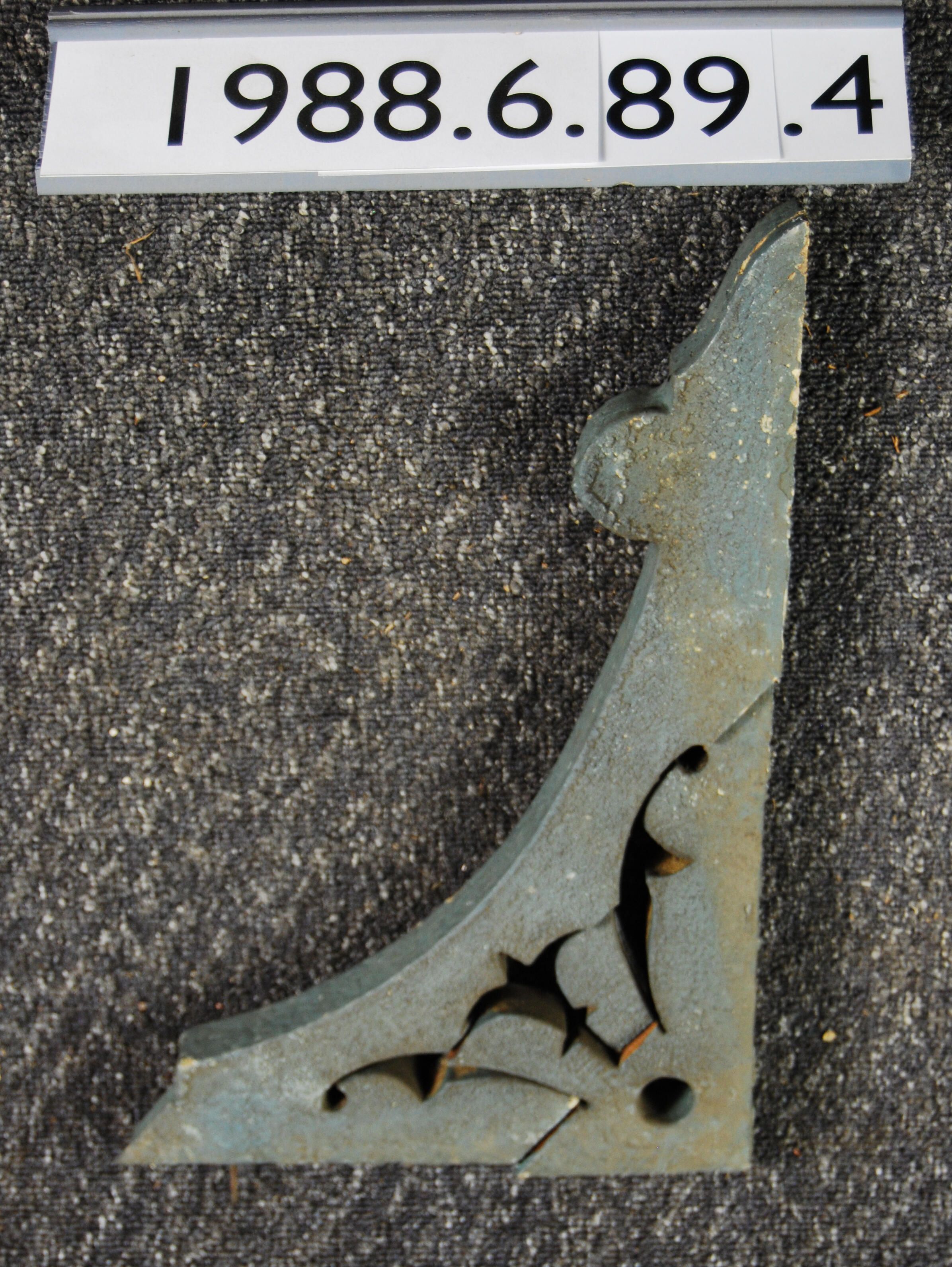 Wood bracket. Fret-work on both sides. Botanical motif. Missing bottom end. Painted grey. Inscriptions or Markings: Manufacturer: Place of Manufacturer: Design motif: Botanical Style: Finish: Painted