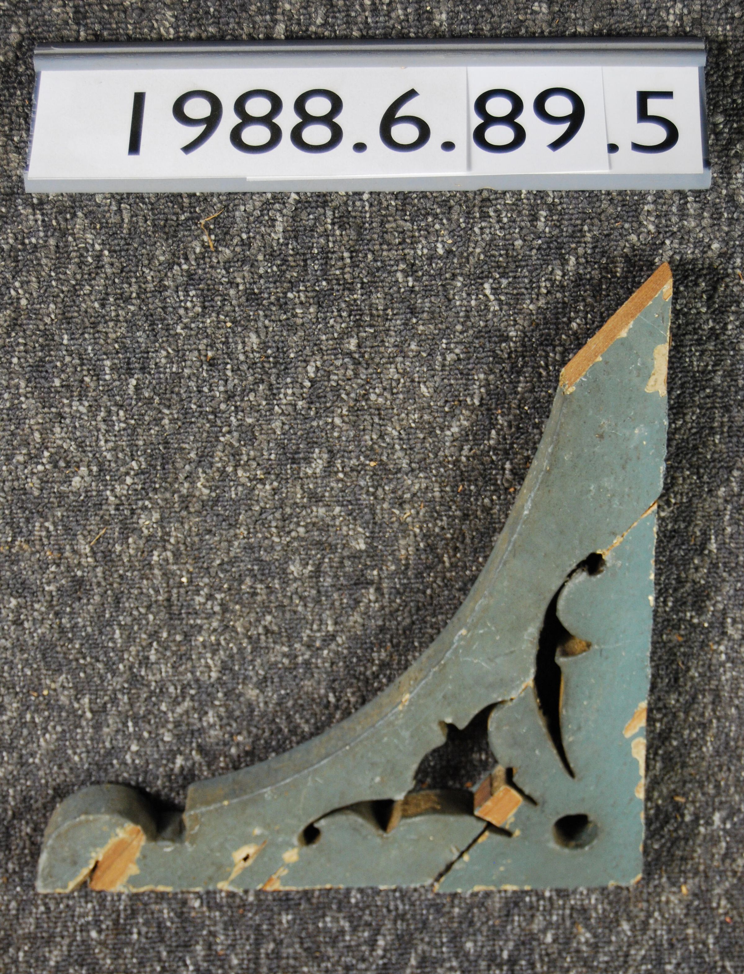 Wood bracket. Fret-work on both sides. Botanical motif. Broken into 3 pieces. Painted grey. Inscriptions or Markings: Manufacturer: Place of Manufacturer: Design motif: Botanical Style: Finish: Painted