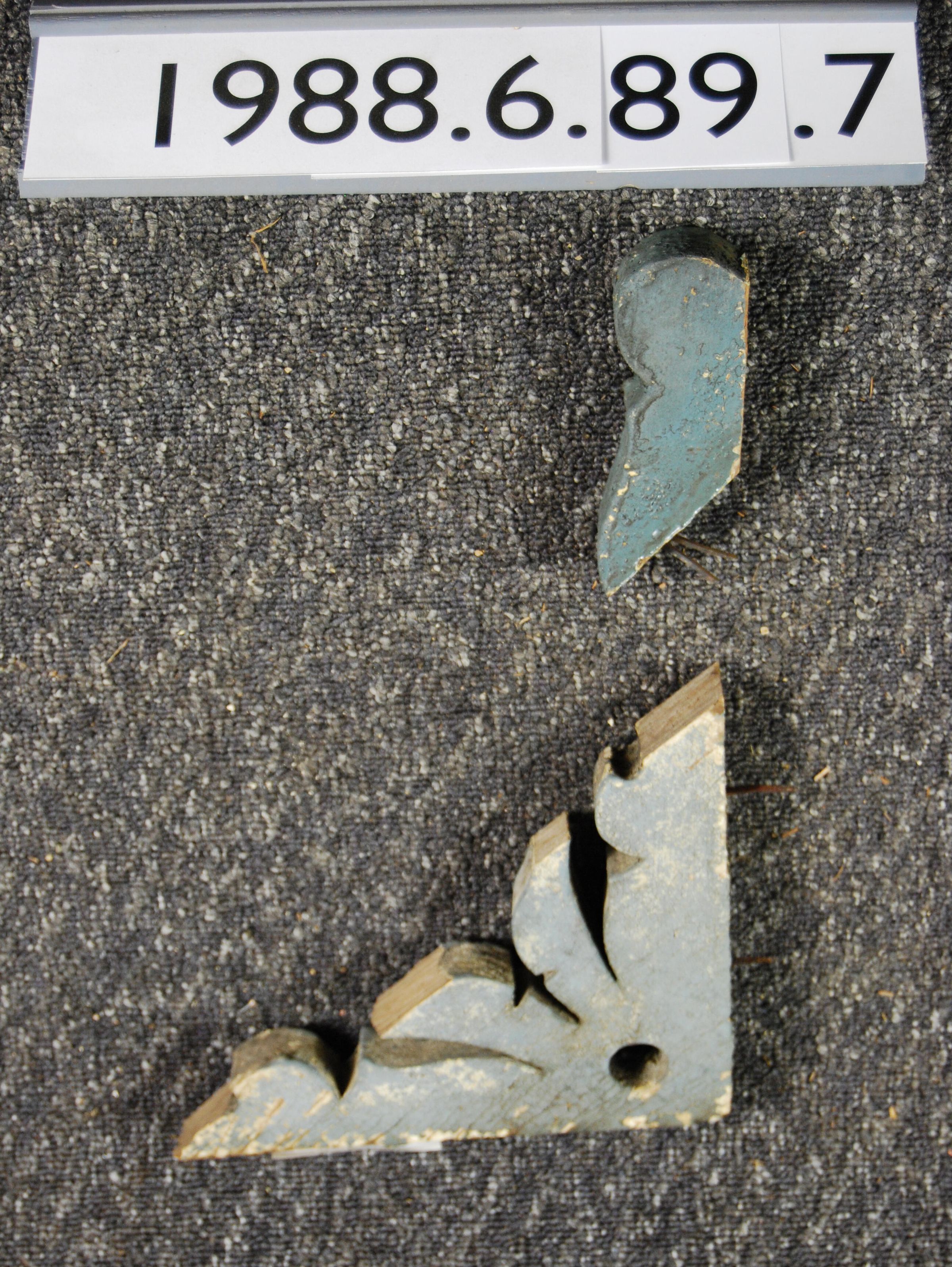Wood cornice bracket. Two bracket fragments. Fret-work. Painted grey. Inscriptions or Markings: Manufacturer: Place of Manufacturer: Design motif: Botanical Style: Finish: Painted