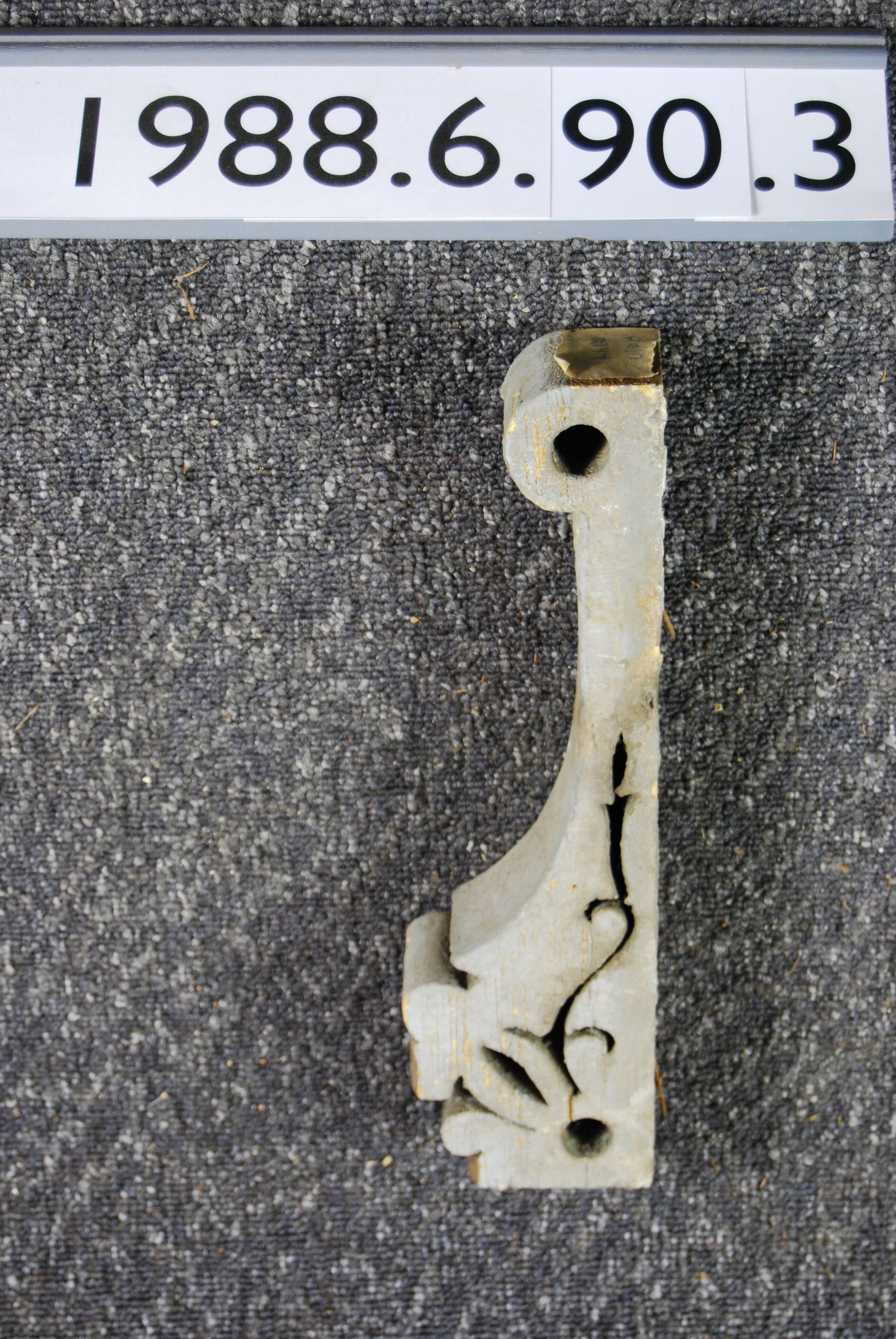 Wood bracket. Fret-work on both sides. Botanical motif. Painted grey. Inscriptions or Markings: Manufacturer: Place of Manufacturer: Design motif: Botanical Style: Finish: Painted