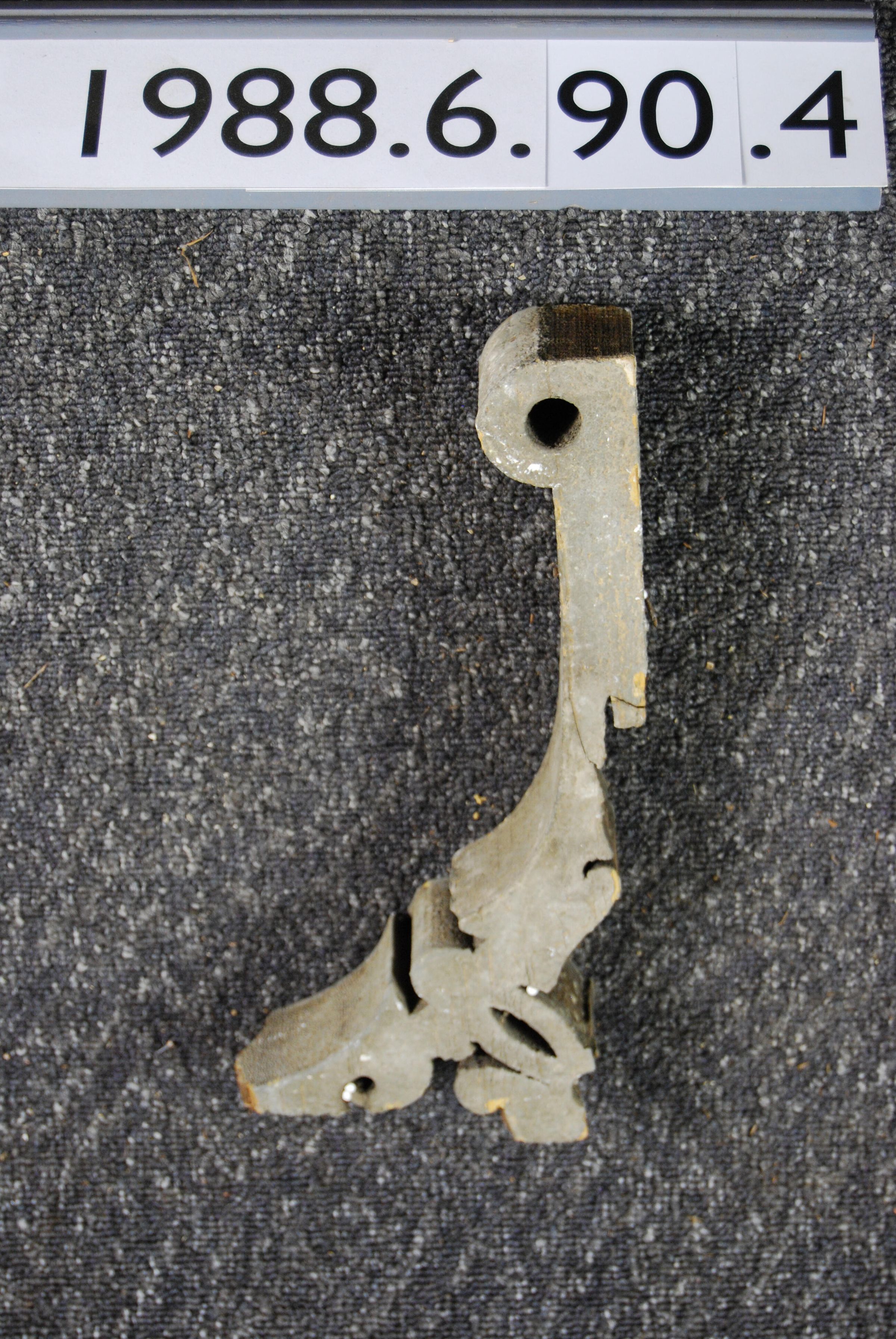 Wood bracket. Fret-work on both sides. Botanical motif. Painted grey. Inscriptions or Markings: Manufacturer: Place of Manufacturer: Design motif: Botanical Style: Finish: Painted