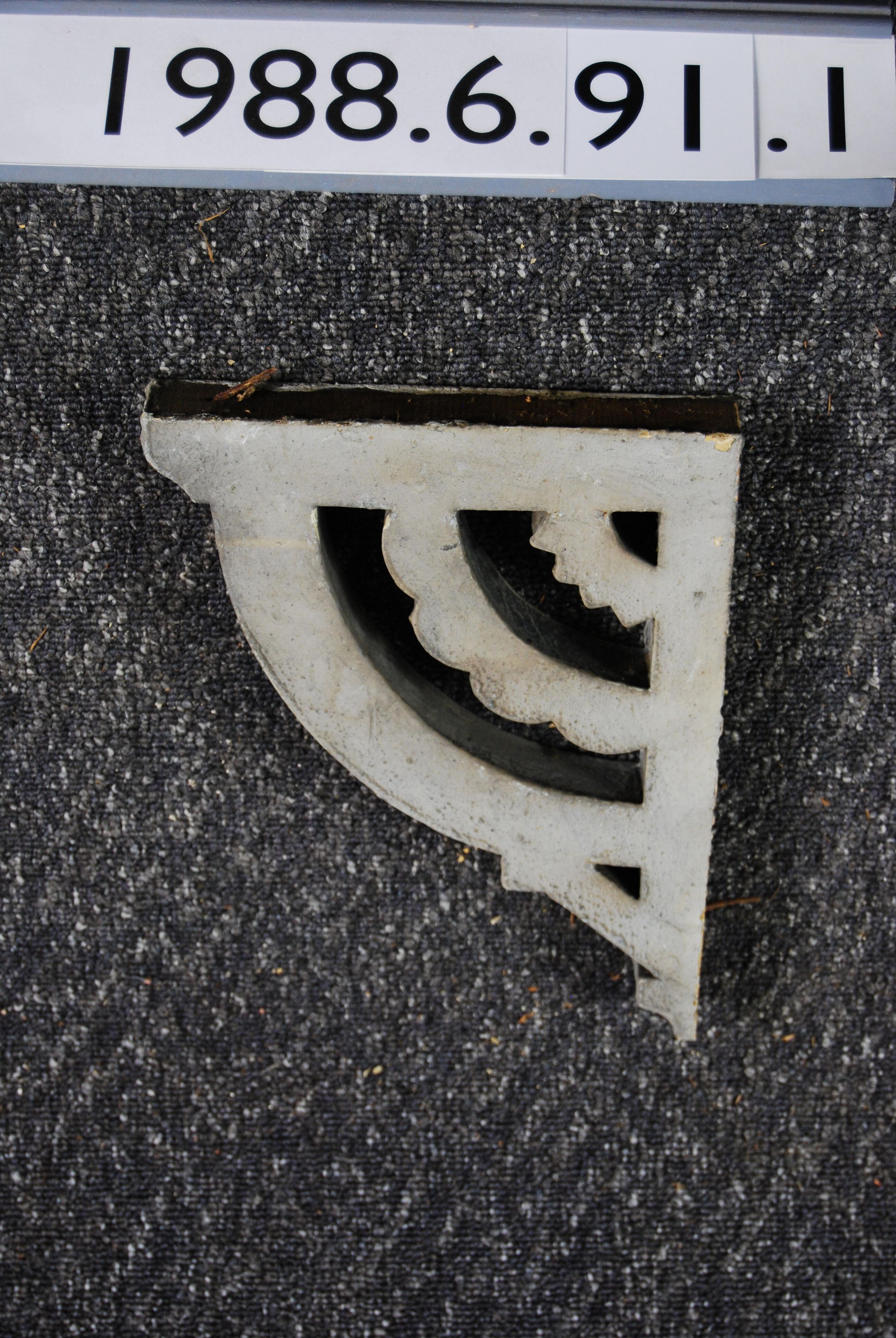 Wood bracket. Fret brackets. Arched semi-circular design. Painted grey. Inscriptions or Markings: Manufacturer: Place of Manufacturer: Design motif: Style: Finish: Painted