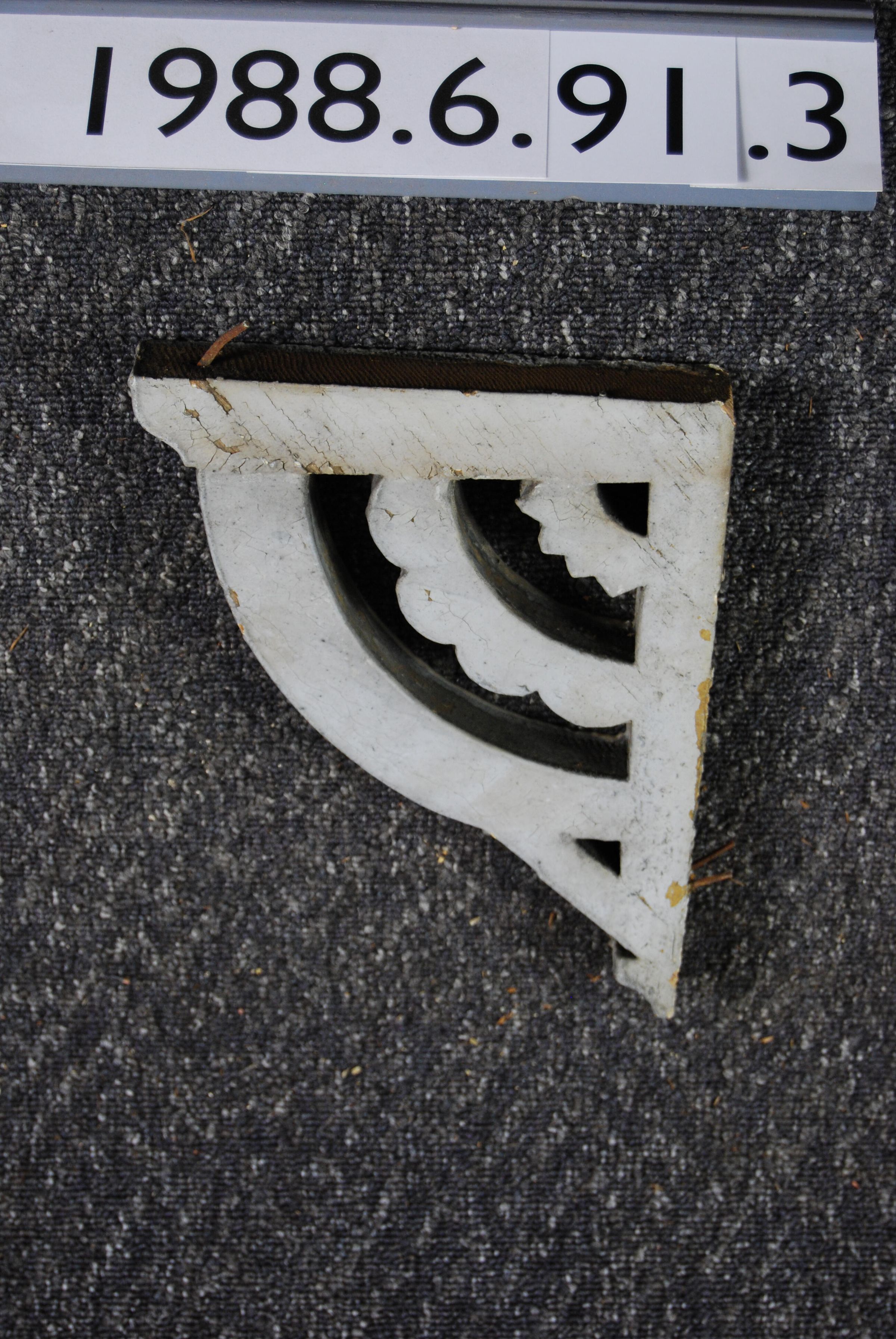 Wood bracket. Fret brackets. Arched semi-circular design. Painted grey. Inscriptions or Markings: Manufacturer: Place of Manufacturer: Design motif: Style: Finish: Painted