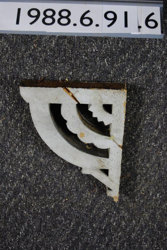 Wood bracket. Fret bracket. Painted grey. Inscriptions or Markings: Manufacturer: Place of Manufacturer: Design motif: Style: Finish: Painted