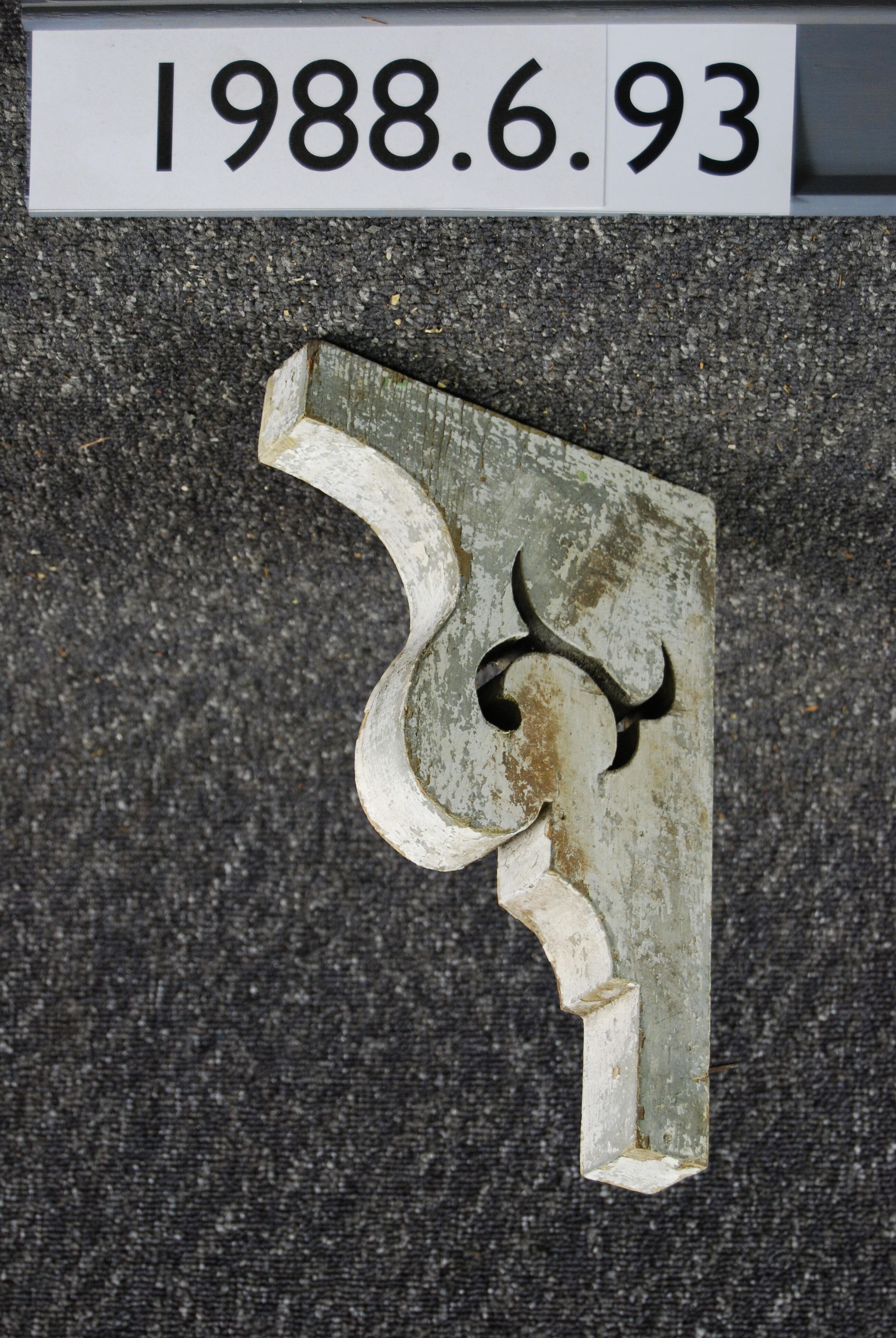 Wood bracket. Fret-cut scroll. Small piece missing. Painted white. Inscriptions or Markings: Manufacturer: Place of Manufacturer: Design motif: Style: Finish: Painted