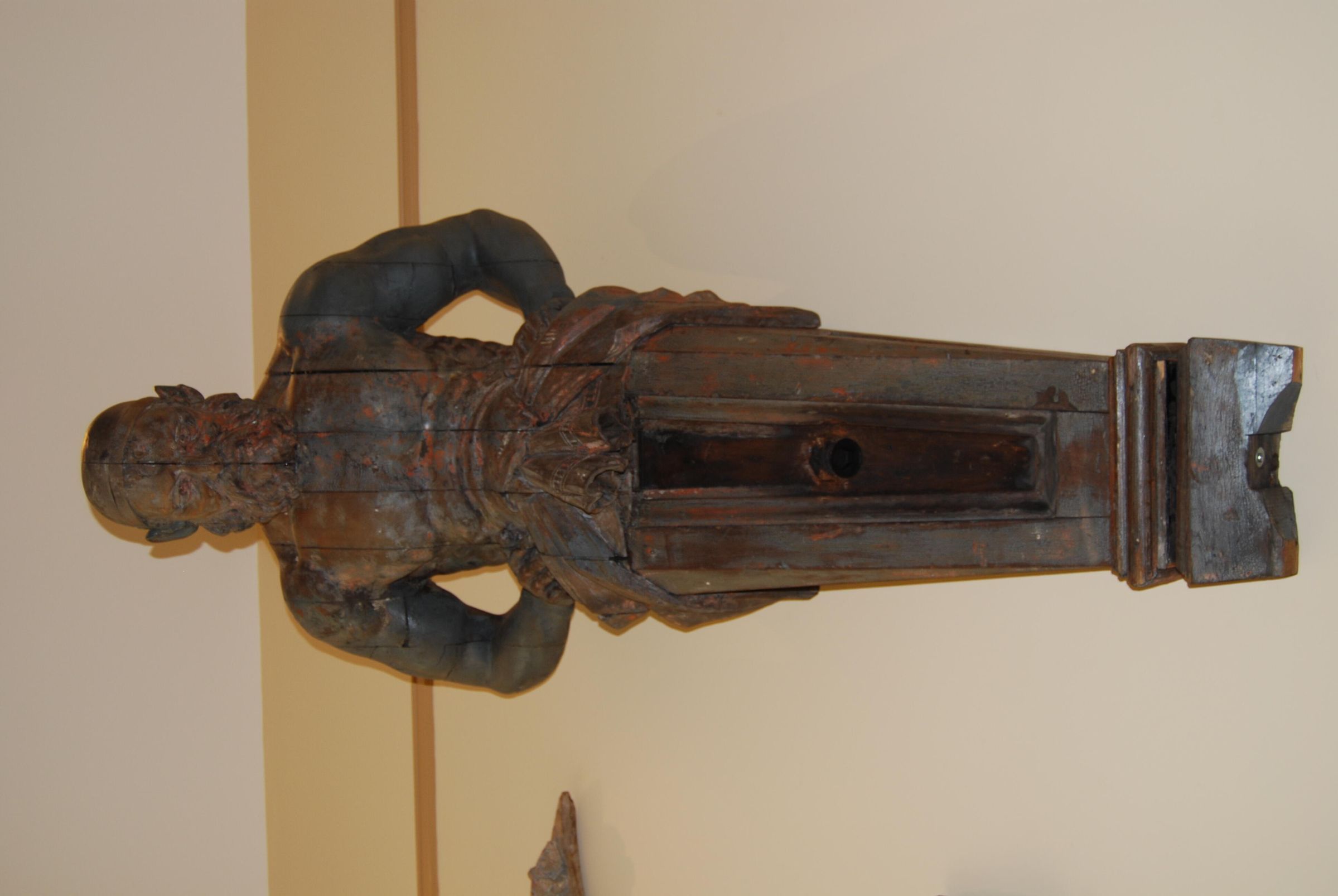 Wood bracket. Fret-cut scroll. Top cracked. Top front end missing. Painted grey. Inscriptions or Markings: Manufacturer: Place of Manufacturer: Design motif: Style: Finish: Painted