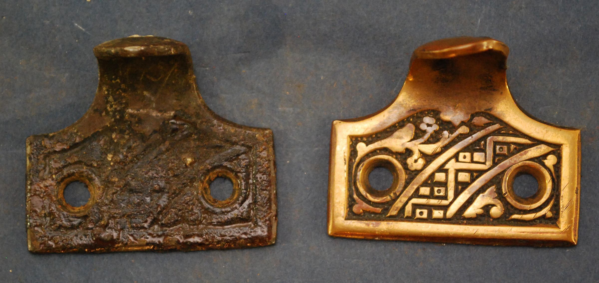 Design Name: Manufacturer: Unknown Style: Material: Bronze Manufacturing Method: Wrought / Stamped Surface Finish: Aged / Unpolished / Plated VDA Classification: VDA Number: Shape: Patent Specifics: Lock Type (If Applicable): Inscription/Makers Mark: Inscription Text: Comments: Finger lift. One is made of steel and plated, other is bronze.