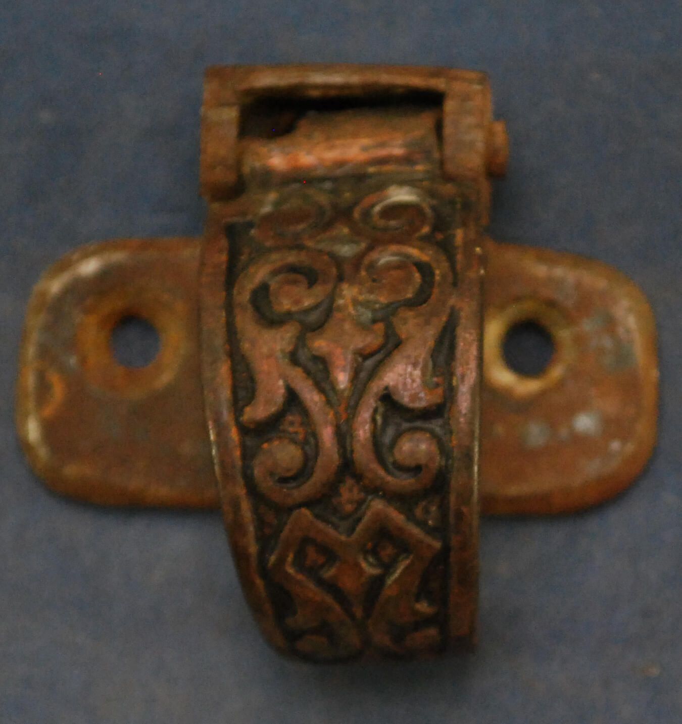 Design Name: Manufacturer: Unknown Style: Neo-Grec Material: Iron Manufacturing Method: Cast Surface Finish: Plated / Japanned VDA Classification: VDA Number: Shape: Patent Specifics: Lock Type (If Applicable): Inscription/Makers Mark: Inscription Text: Comments: Finger lift, lift combined with latch.