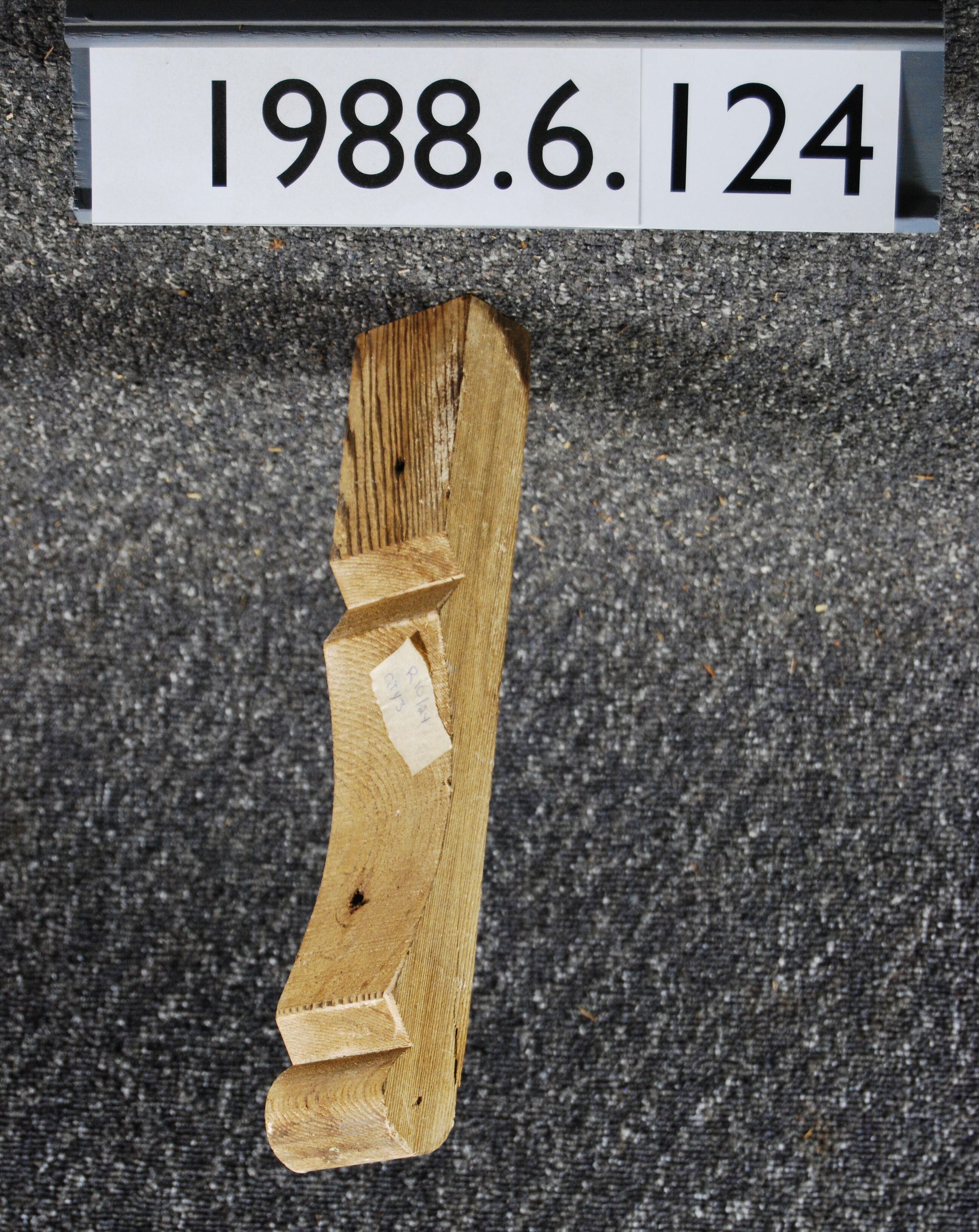 Wood bracket, (rafter tail) Compound contour. Cut out of flat block. Stripped of paint. Inscriptions or Markings: Manufacturer: Place of Manufacturer: Design motif: Style: Finish: Stripped