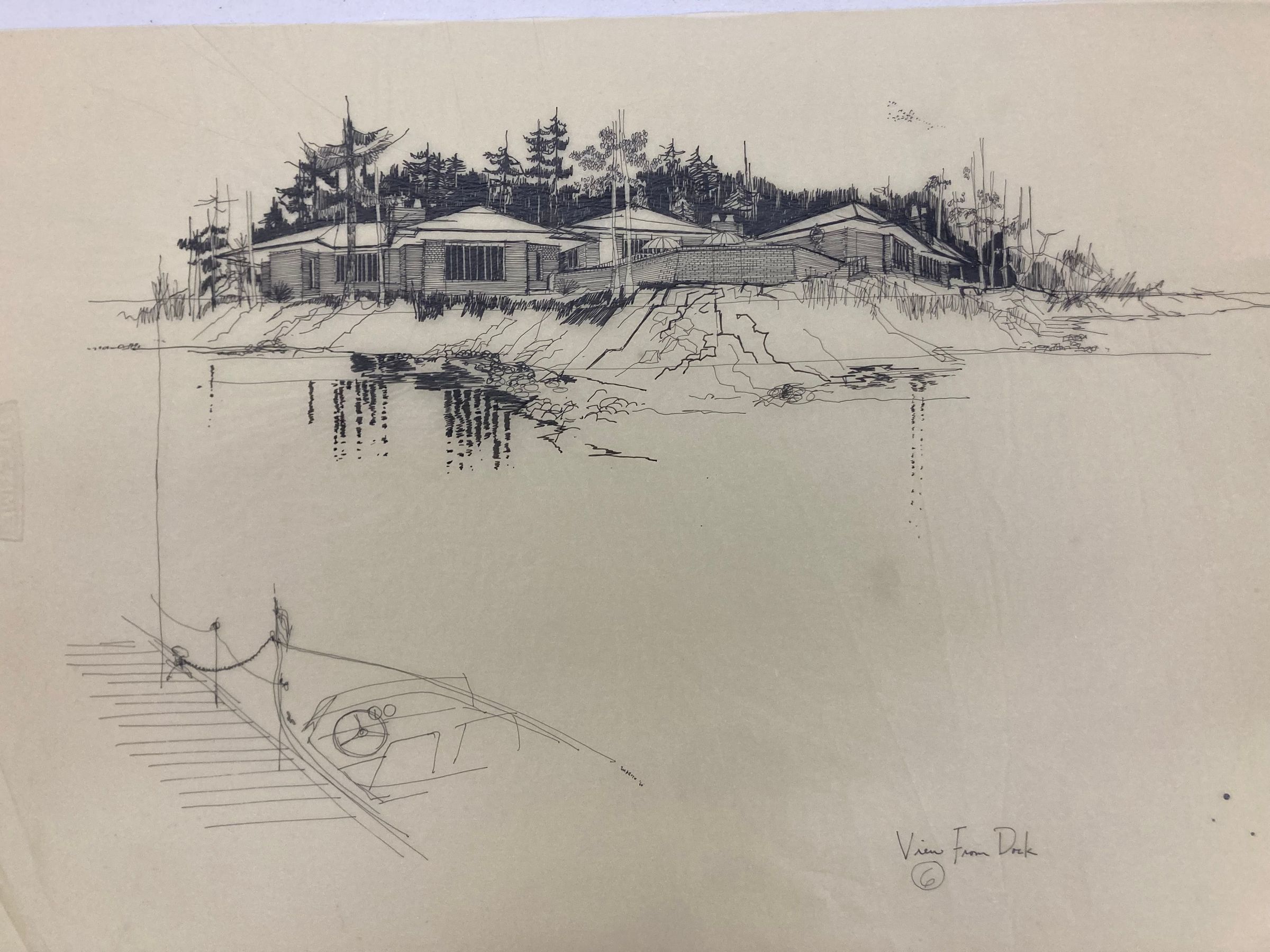 List of drawings in set: Perspective, Approach from Pool; Perspective, West Entrance to Lounge; Perspective, View of Sound & Sun Terrace; Perspective, Sun Terrace & Lounge; Perspective, Lounge Interior; Perspective, View from Dock; Floor Plan