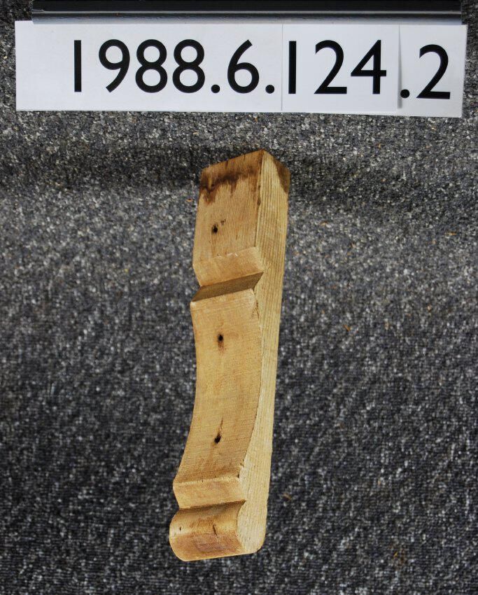 Wood bracket, (rafter tail) compound contour. Cut out of flat block. Stripped of paint. Inscriptions or Markings: Manufacturer: Place of Manufacturer: Design motif: Style: Finish: Stripped