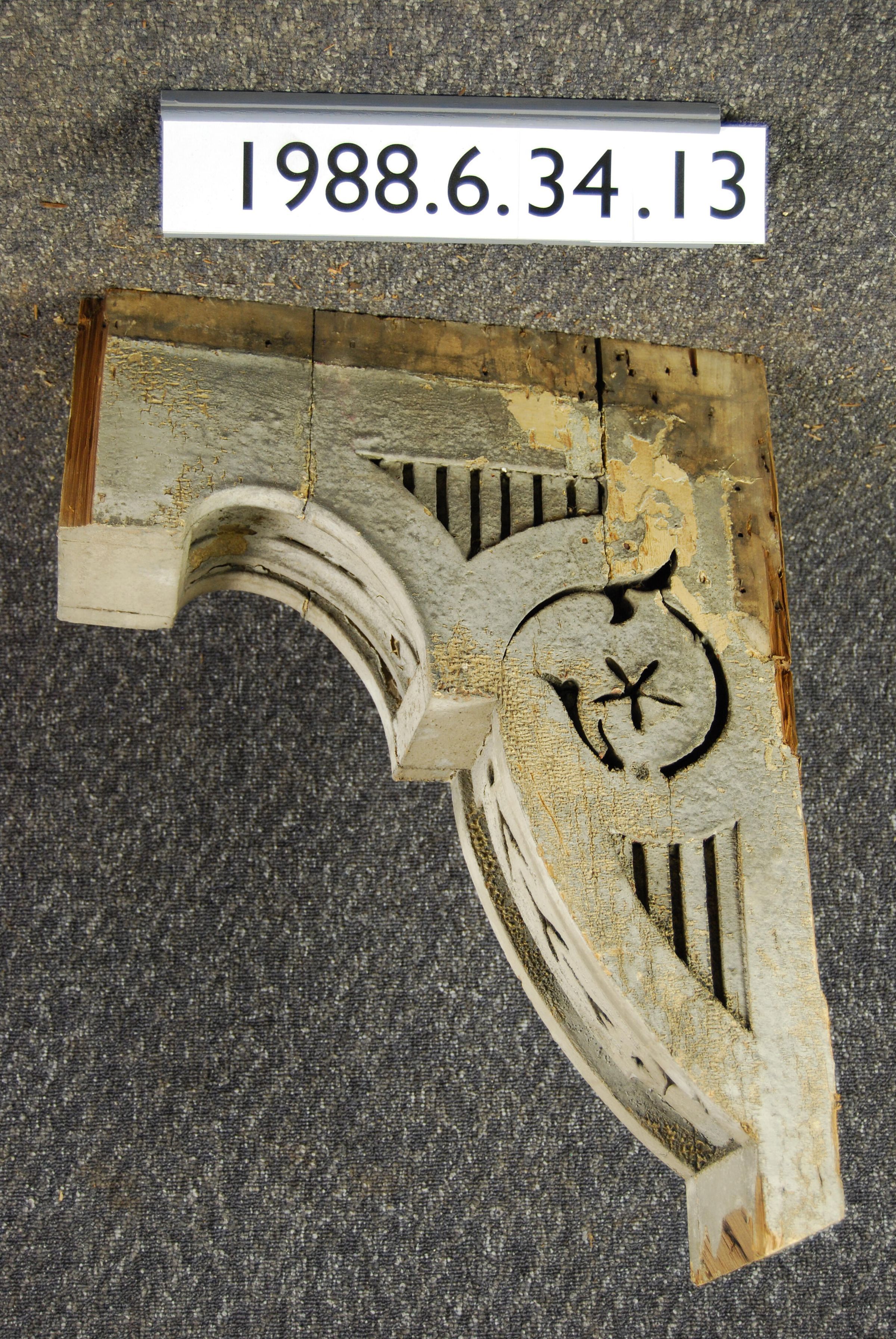 Wood cornice bracket. Scrolled sides. Recessed fluted panels at sides. Aesthetic movement ornamentation. Painted grey. Inscriptions or Markings: Manufacturer: Place of Manufacturer: Design motif: Style: Finish: Painted
