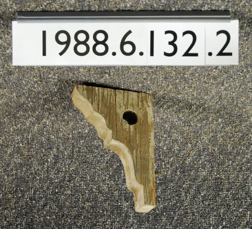Wood bracket. Compound contour. Hole through side. Painted grey. Inscriptions or Markings: Manufacturer: Place of Manufacturer: Design motif: Style: Finish: Painted