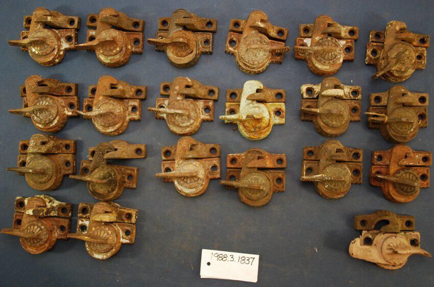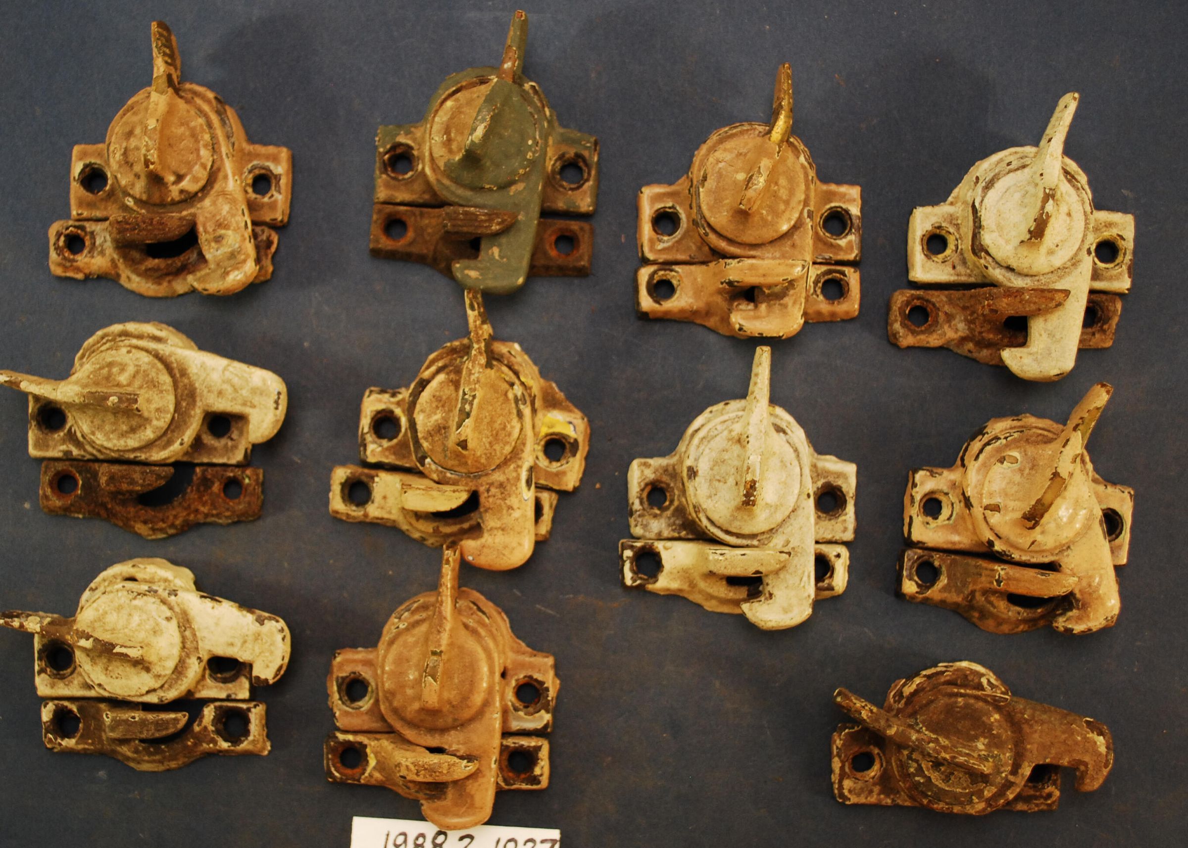 Comments: Remnants of Japanned finish, some with later paint, matching latches and catches, one catch is missing.Lexicon