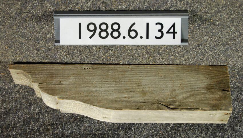 Wood bracket. Horizontal. Compound contour at front end. Remnants of white paint. Inscriptions or Markings: Manufacturer: Place of Manufacturer: Design motif: Style: Finish: Painted