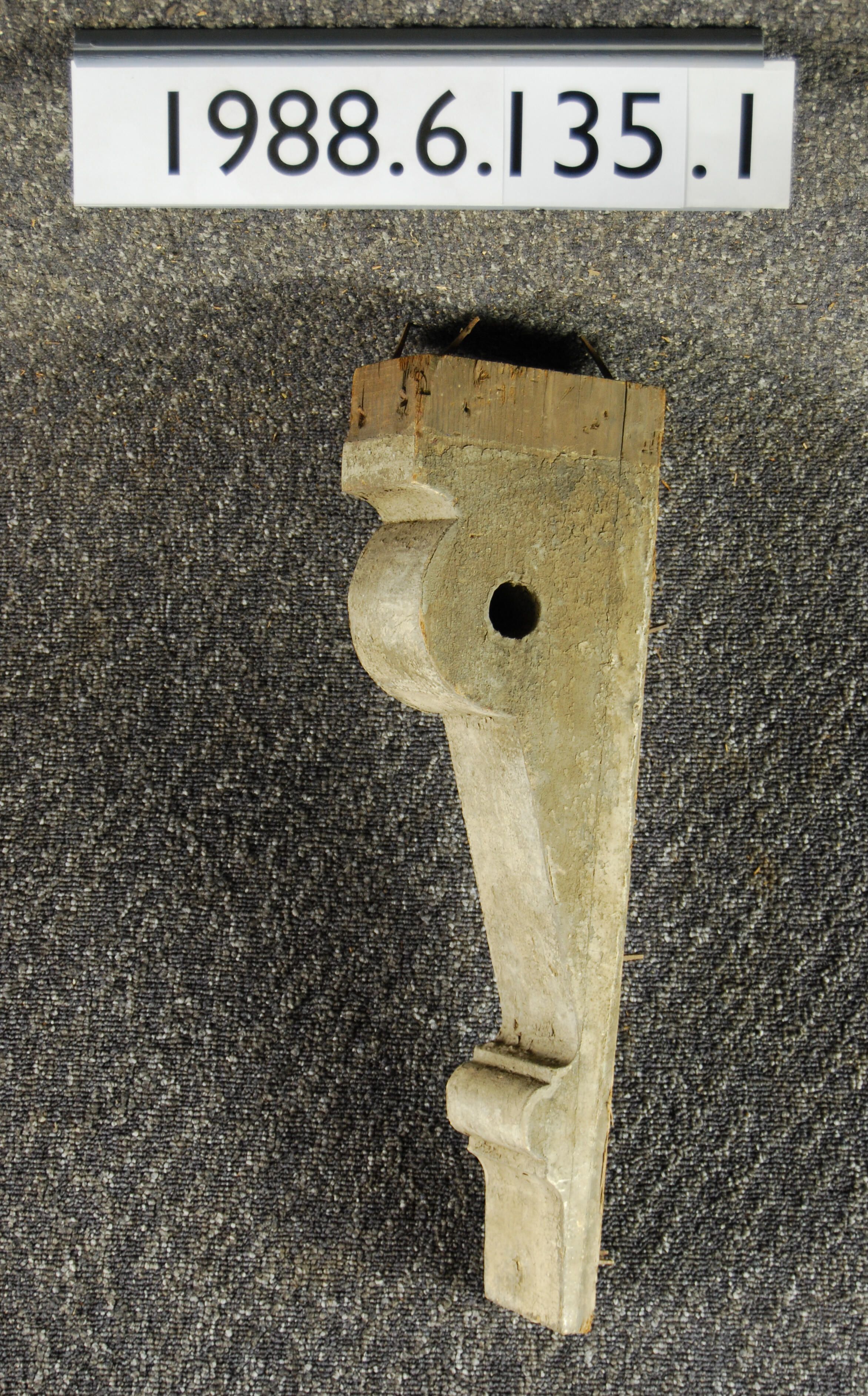 Wood bracket. Compound contour. Hole through side. Painted grey. Inscriptions or Markings: Manufacturer: Place of Manufacturer: Design motif: Style: Finish: Painted