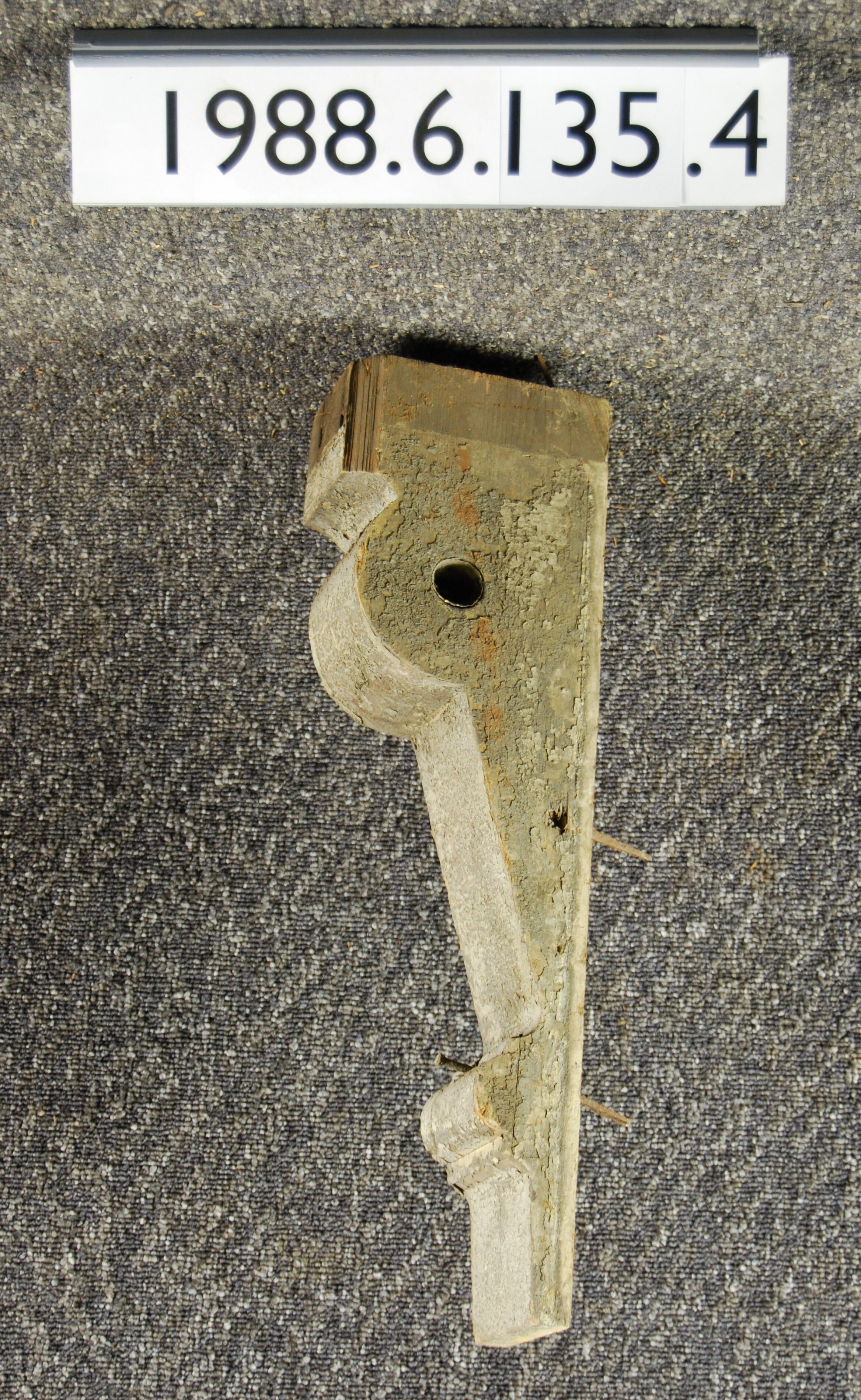 Wood bracket. Compound contour. Hole through side. Painted grey. Inscriptions or Markings: Manufacturer: Place of Manufacturer: Design motif: Style: Finish: Painted