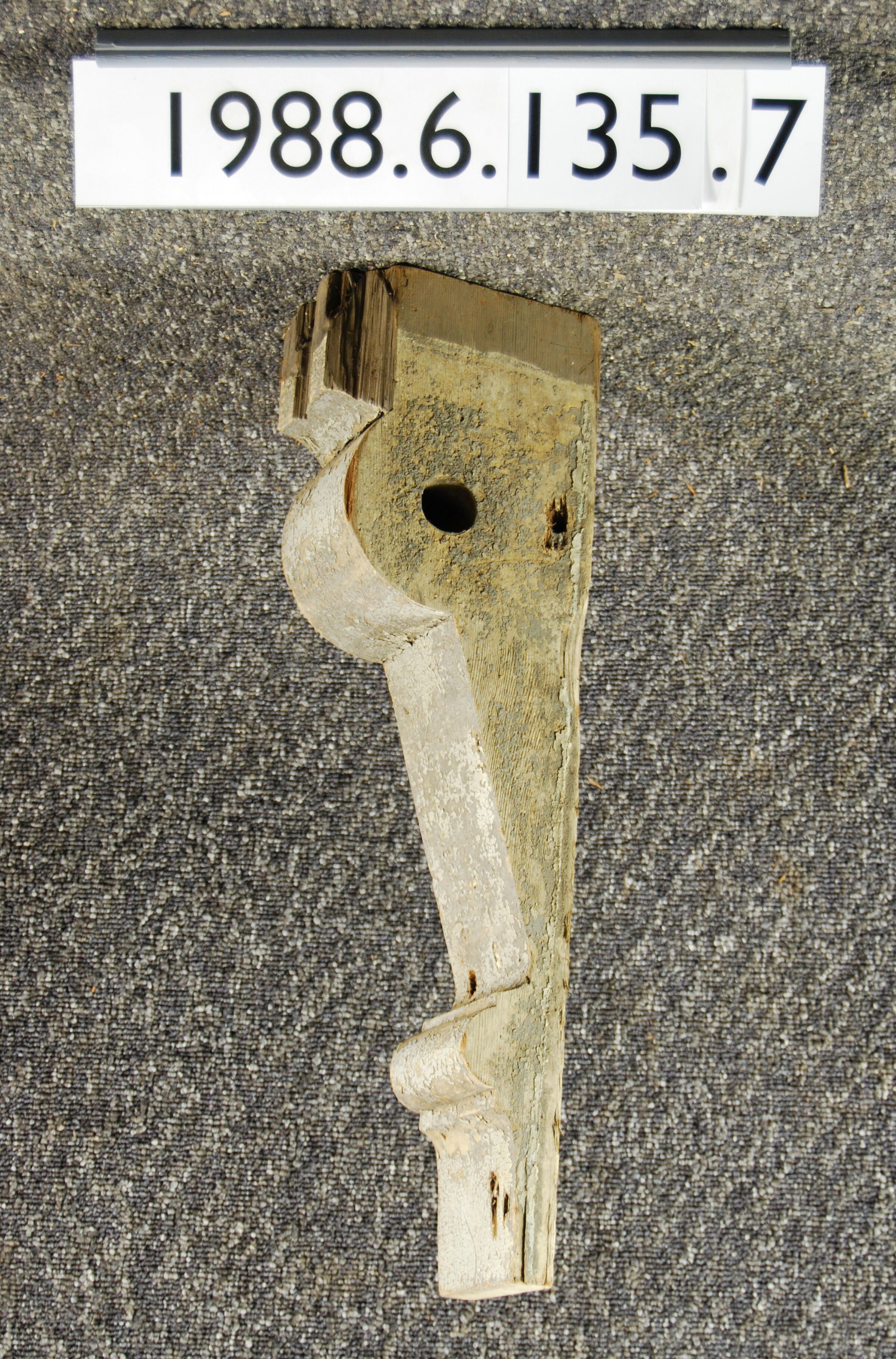 Wood bracket. Compound contour. Hole through side. Painted grey. Inscriptions or Markings: Manufacturer: Place of Manufacturer: Design motif: Style: Finish: Painted