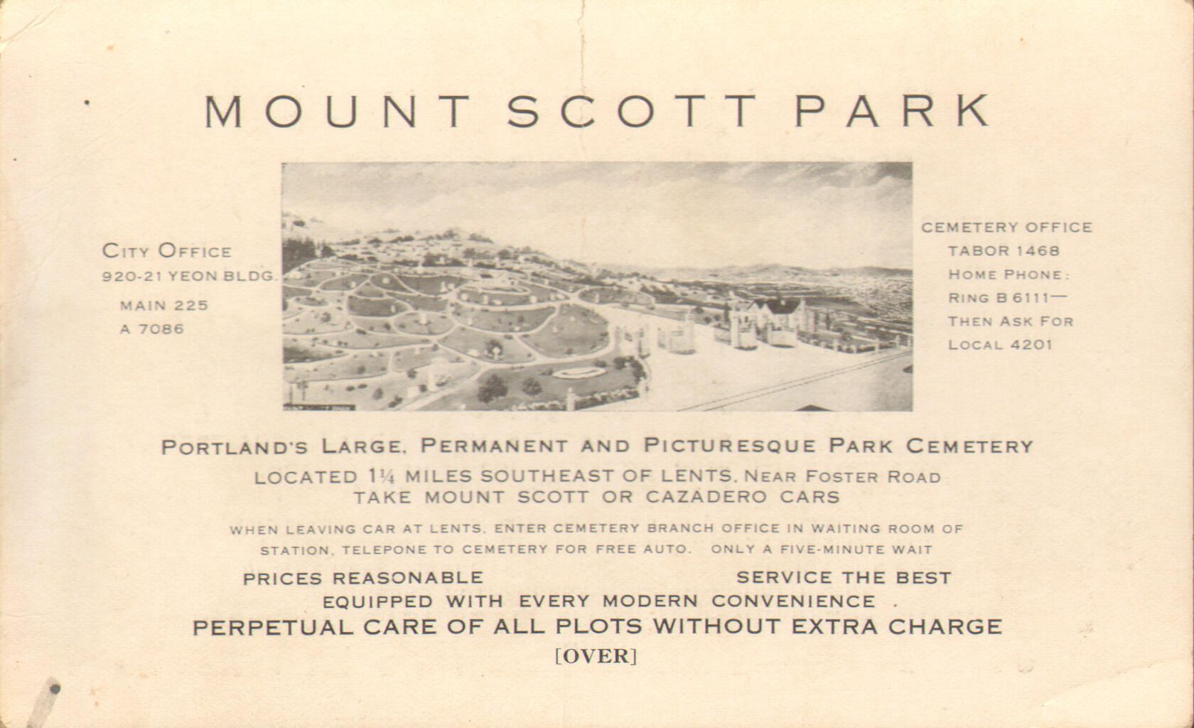 Building/location:Mount Scott Park Subject Matter:Cemetery Image process:B&W Lithograph Architect: Building Description: List of Drawings in set: