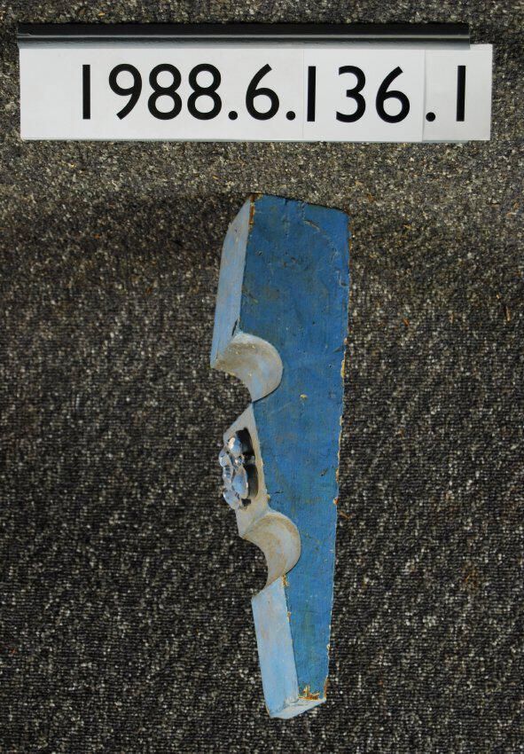 Wood bracket. Coved indents. Has Later plaster ornament attached to front. Painted blue. Inscriptions or Markings: Manufacturer: Place of Manufacturer: Design motif: Style: Finish: Painted