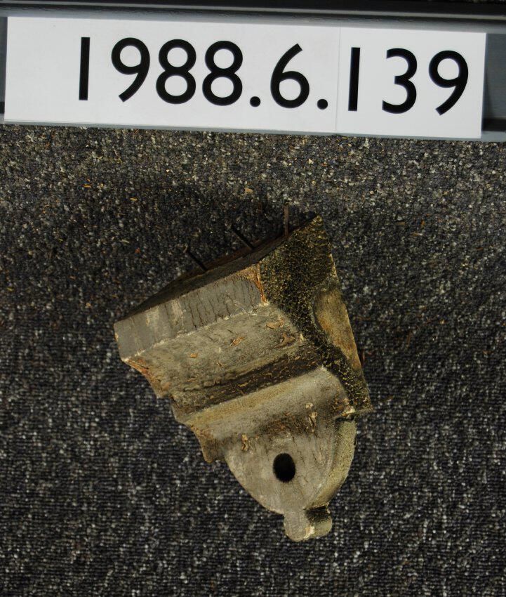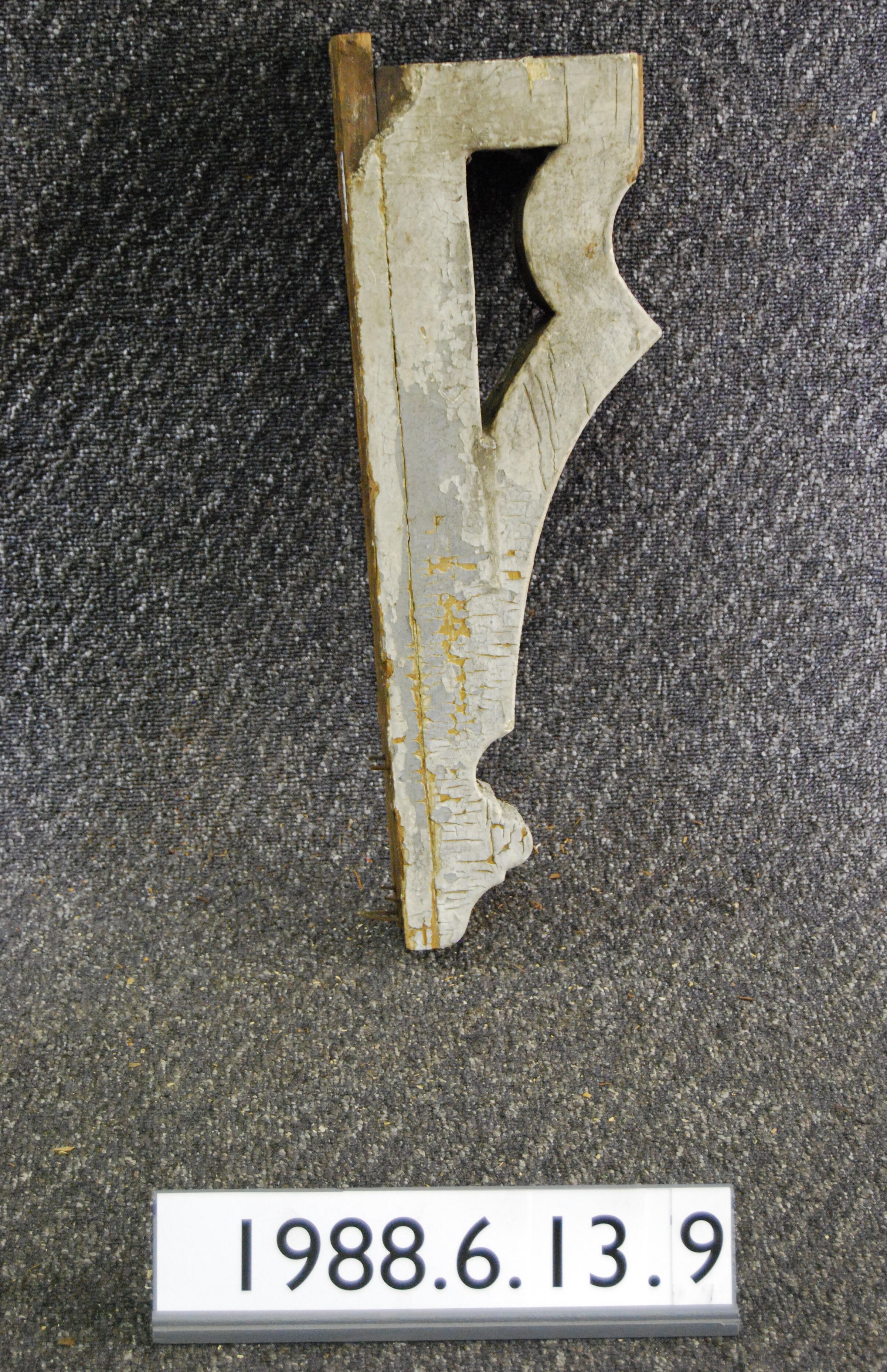 Wood bracket. Angled top. Compound contour. Semi-circular drop with hole. Painted grey. Inscriptions or Markings: Manufacturer: Place of Manufacturer: Design motif: Style: Finish: Painted