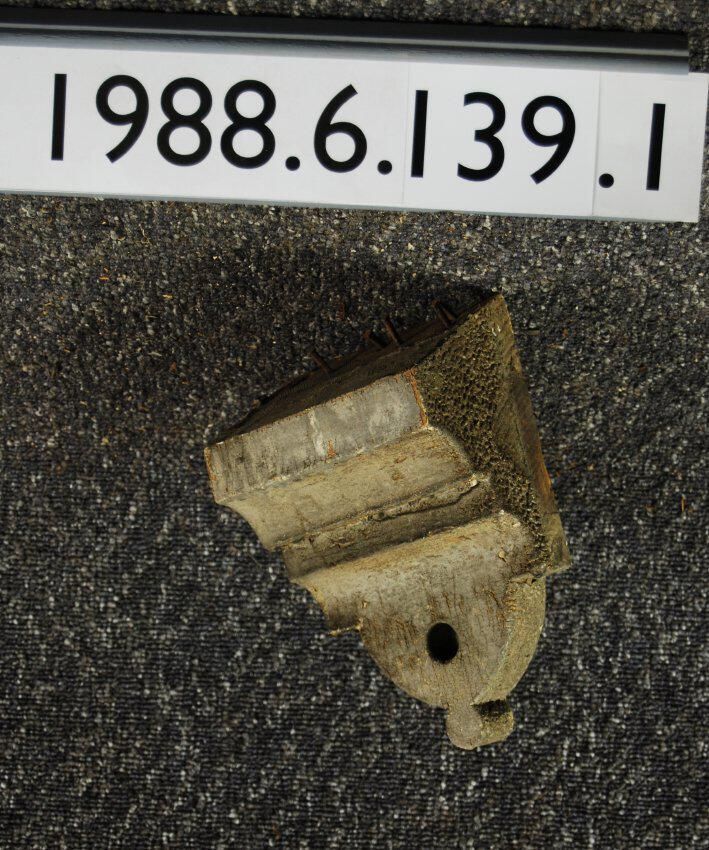 Wood bracket. Angled top. Compound contour. Semi-circular drop with hole. Painted grey. Inscriptions or Markings: Manufacturer: Place of Manufacturer: Design motif: Style: Finish: Painted