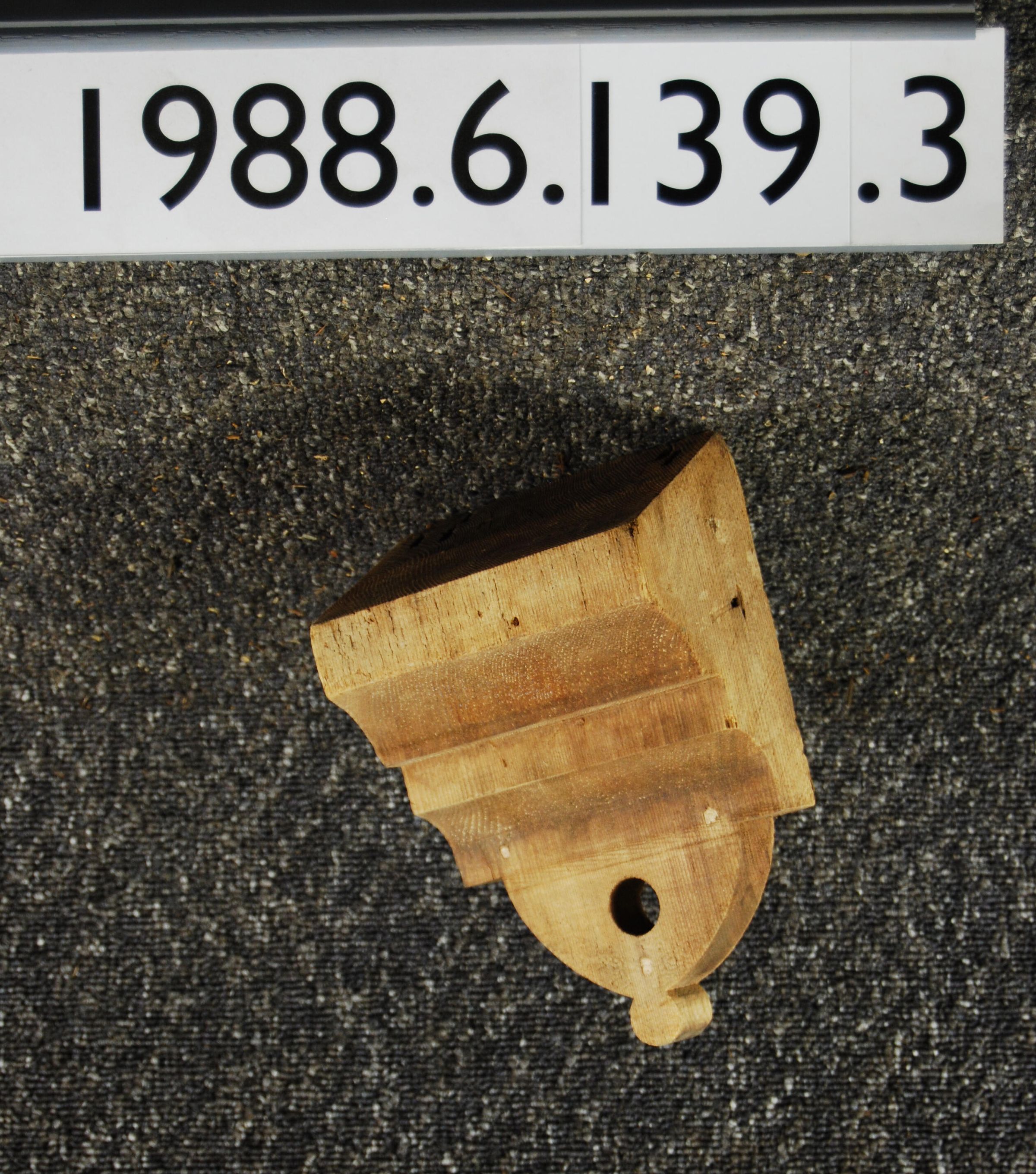 Wood bracket. Angled top. Compound contour. Semi-circular drop with hole. Unpainted - stripped of original paint. Inscriptions or Markings: Manufacturer: Place of Manufacturer: Design motif: Style: Finish: Painted / Stripped