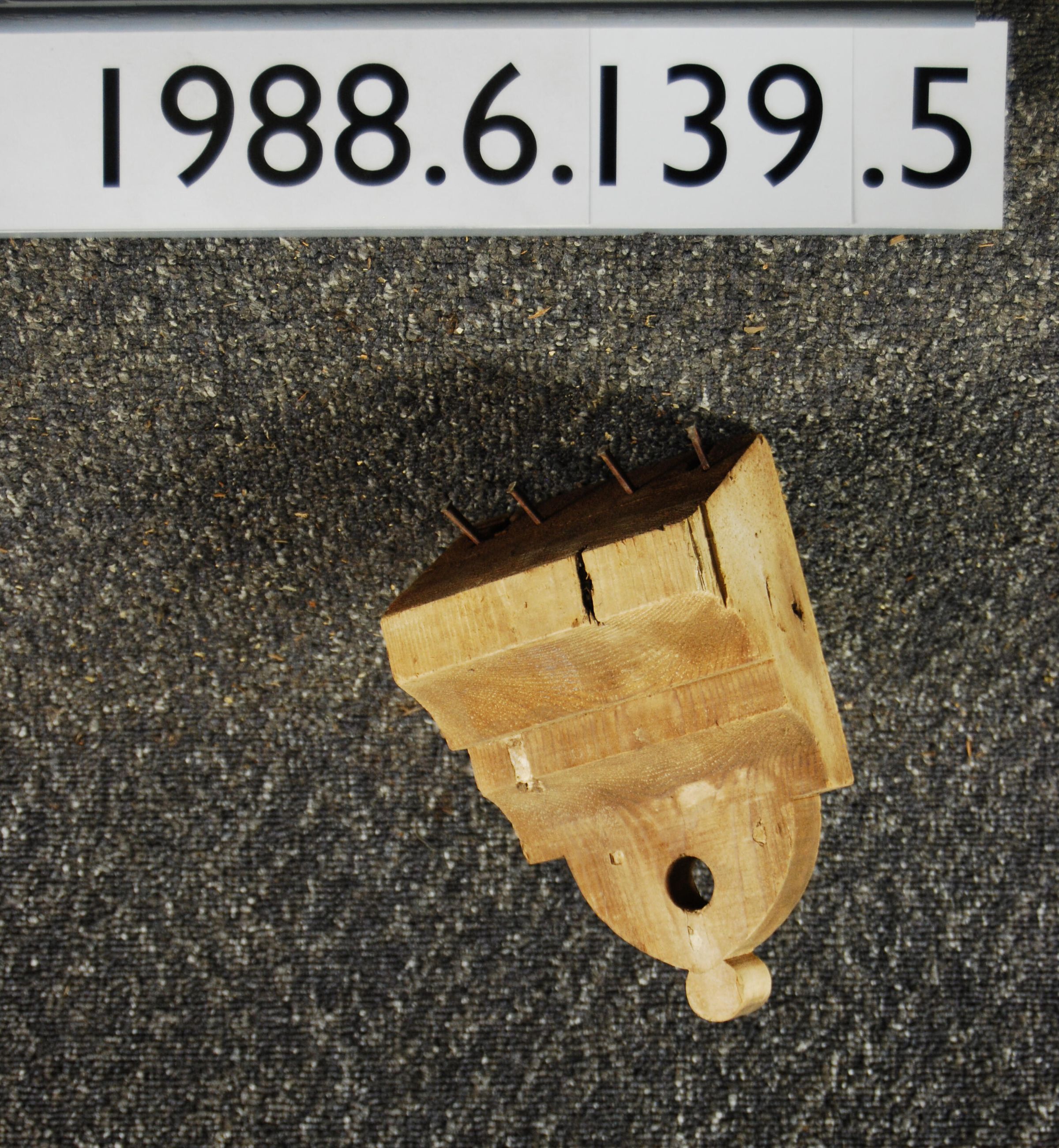 Wood bracket. Angled top. Compound contour. Semi-circular drop with hole. Unpainted - stripped of original paint. Inscriptions or Markings: Manufacturer: Place of Manufacturer: Design motif: Style: Finish: Painted / Stripped