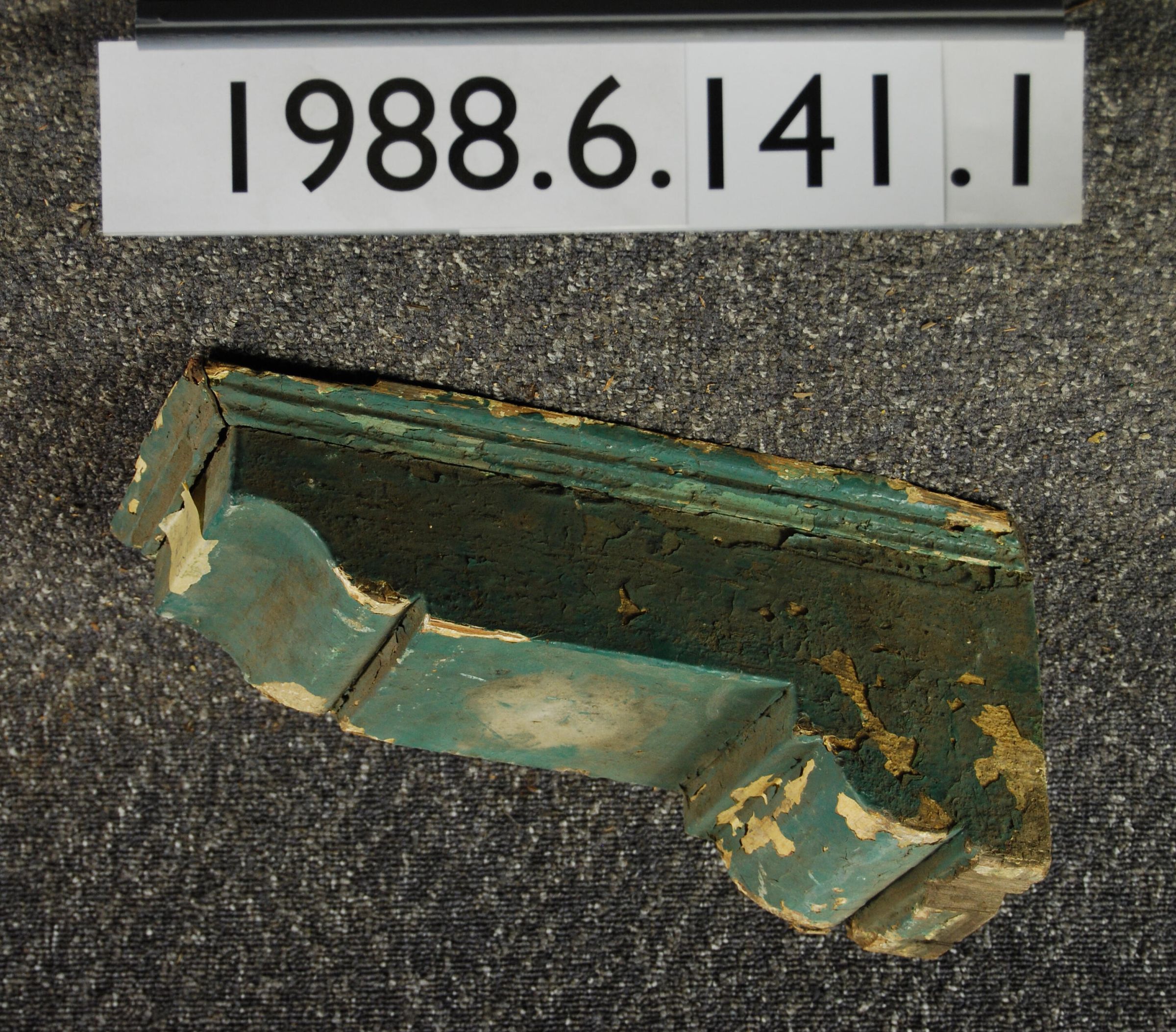 Wood bracket. Horizontal-positioned. Block-cut. Molding enclosed top. Painted green. Inscriptions or Markings: Manufacturer: Place of Manufacturer: Design motif: Style: Finish: Painted