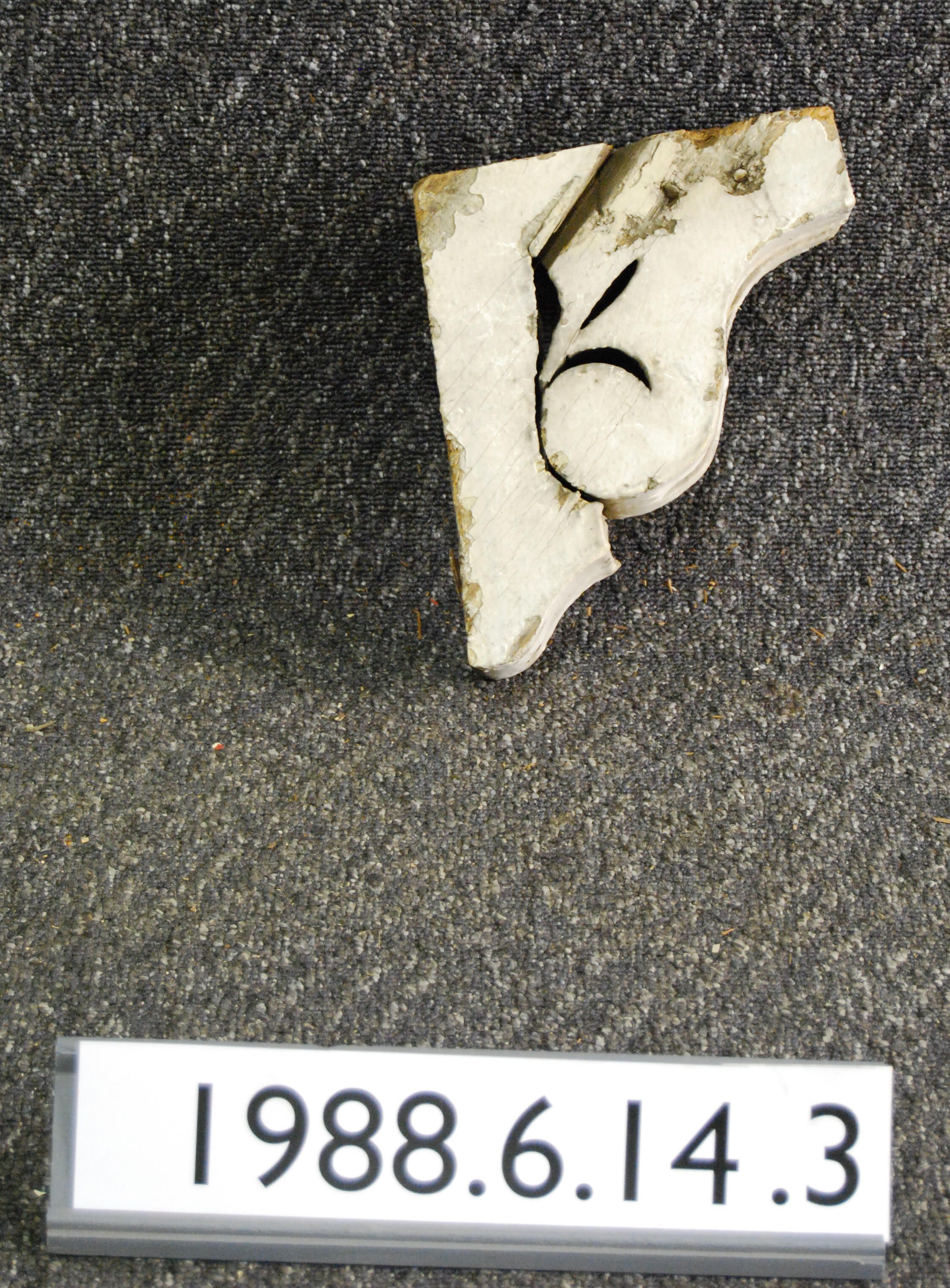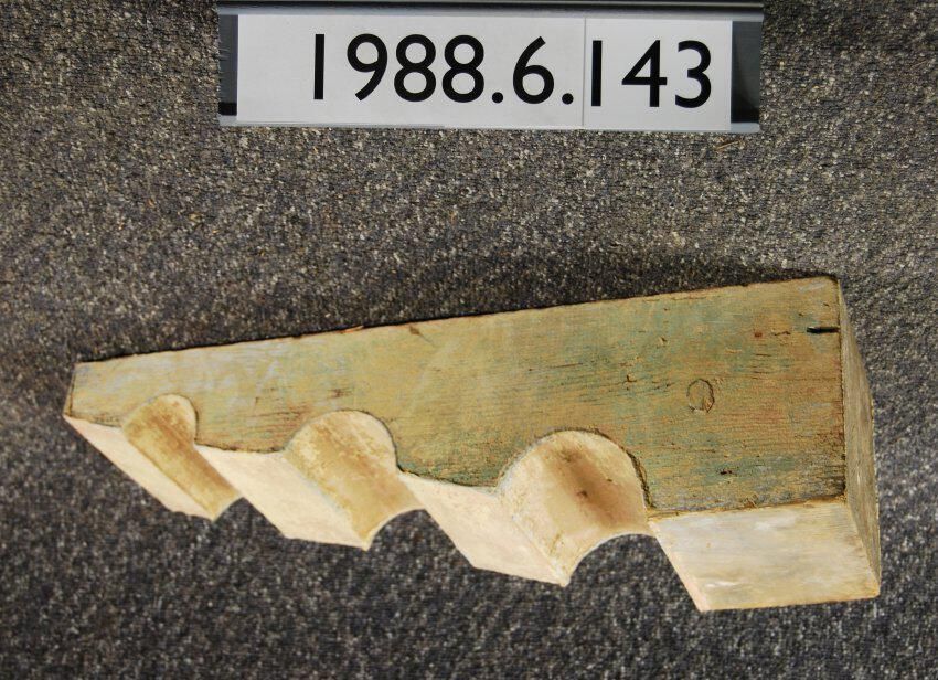Wood bracket. Scallop cut / relief. Profile piece is block cut. Multi-colored paint remnants. Inscriptions or Markings: Manufacturer: Place of Manufacturer: Design motif: Style: Finish: Painted