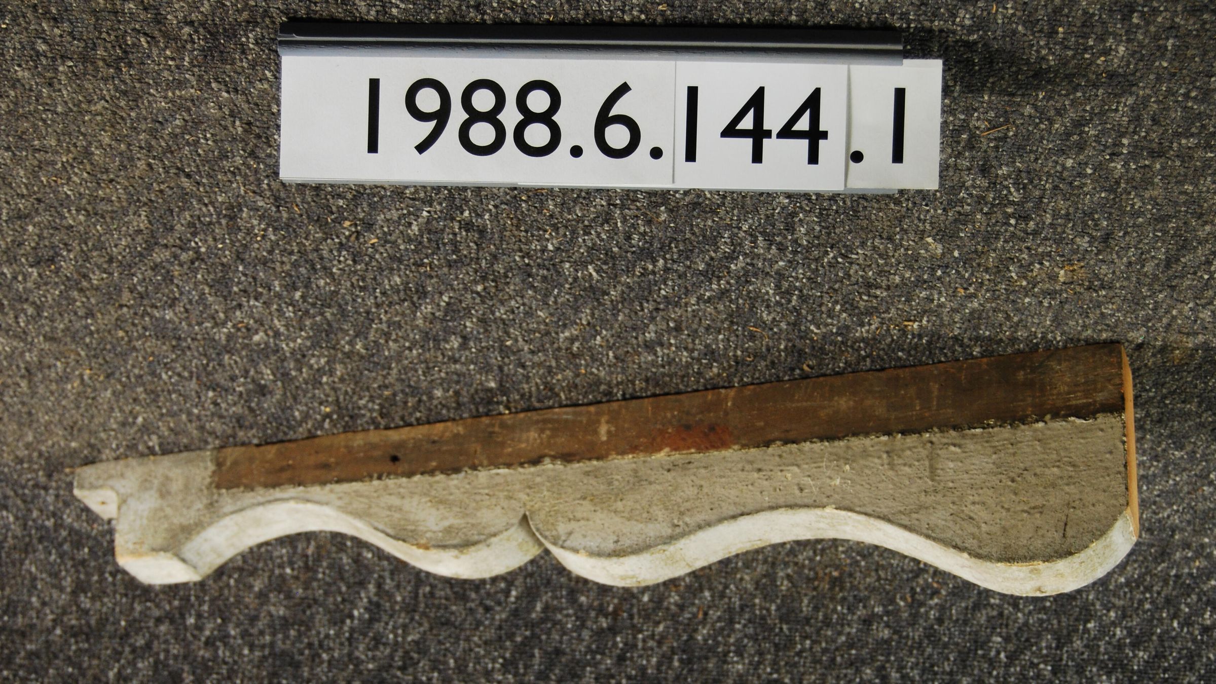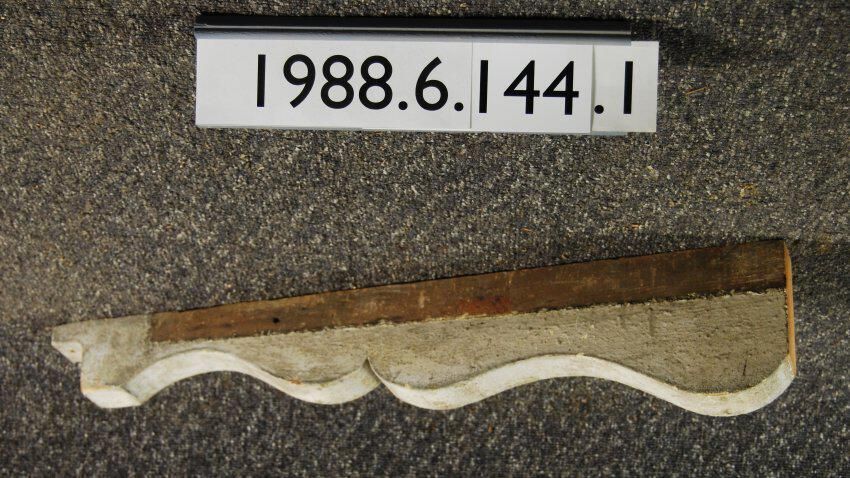 Wood bracket. Compound contour. Rectangular front end extends from top. Paint remnants -- Painted grey-white. Inscriptions or Markings: Manufacturer: Place of Manufacturer: Design motif: Style: Finish: Painted