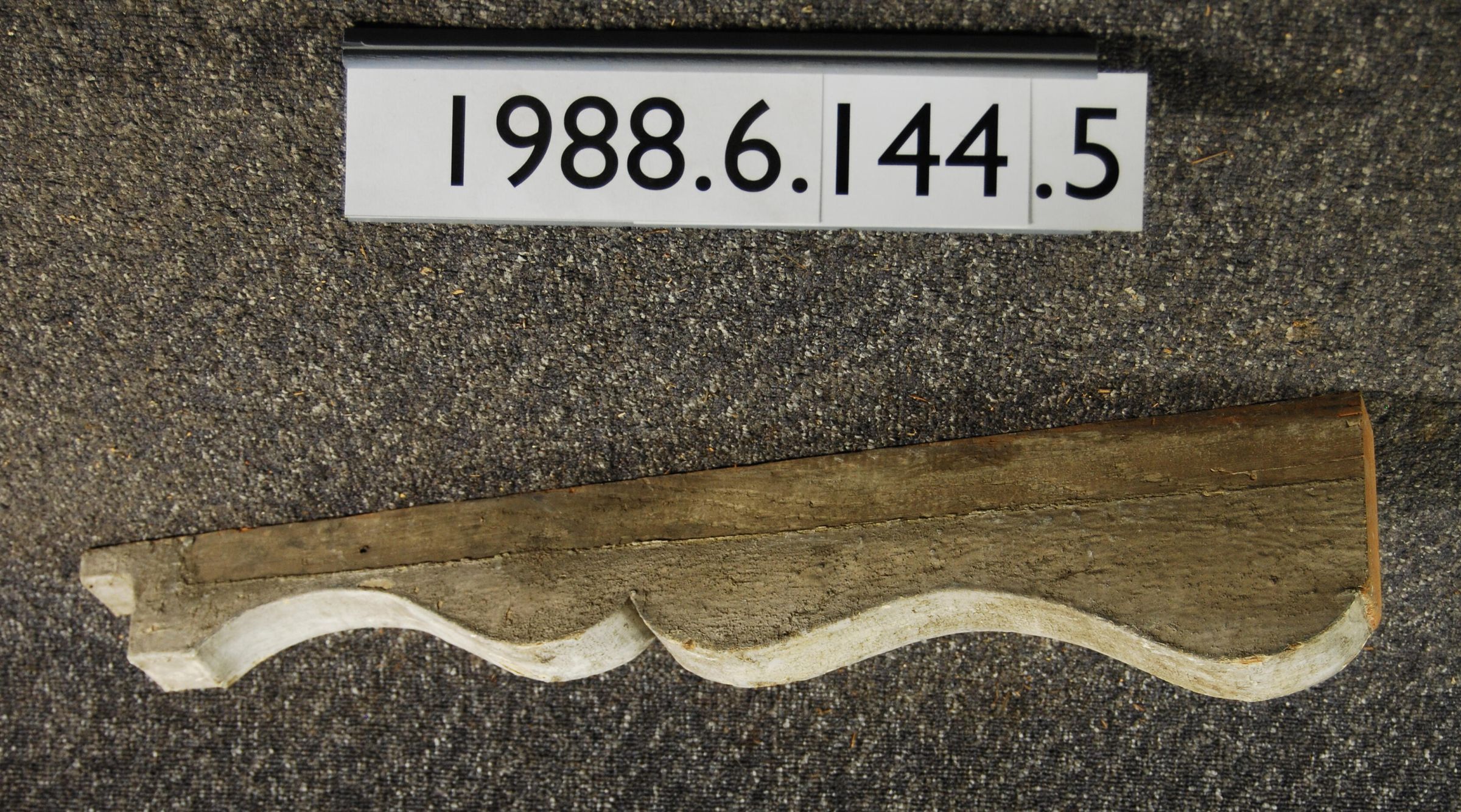 Wood bracket. Compound contour. Rectangular front end extends from top. Paint remnants -- Painted grey-white. Inscriptions or Markings: Manufacturer: Place of Manufacturer: Design motif: Style: Finish: Painted