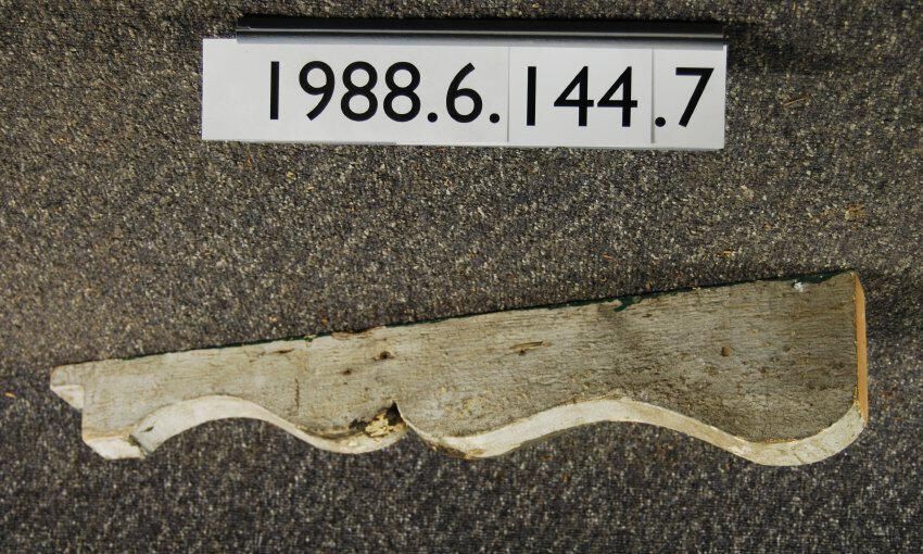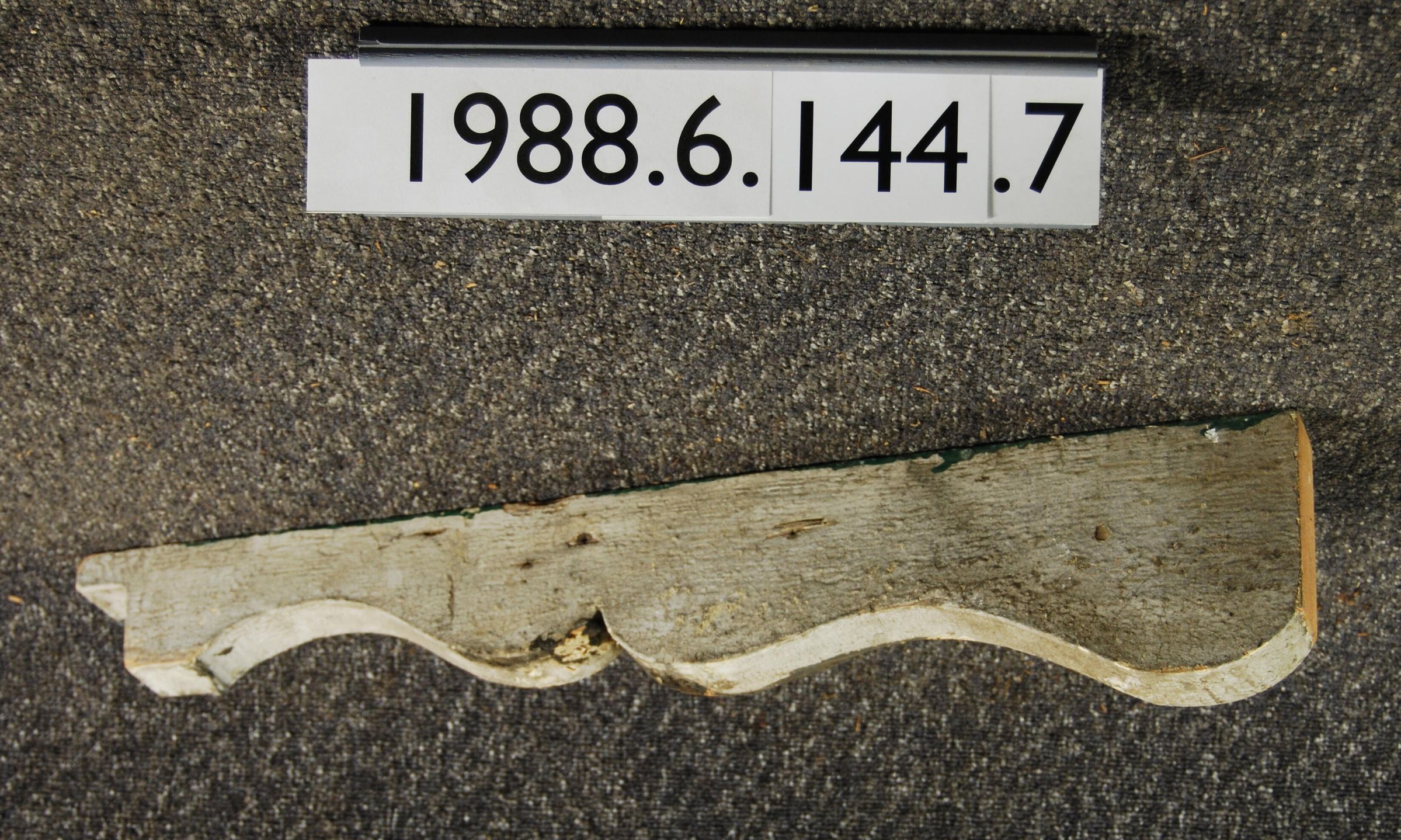 Wood bracket. Compound contour. Rectangular front end extends from top. Painted grey-white, green. Inscriptions or Markings: Manufacturer: Place of Manufacturer: Design motif: Style: Finish: Painted