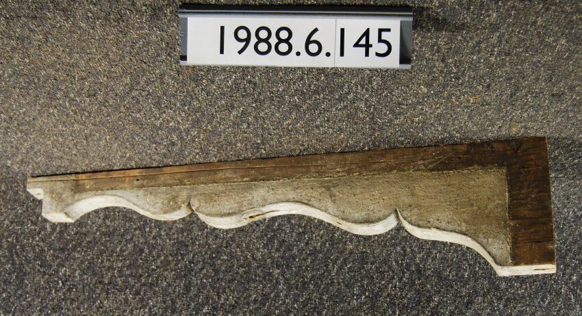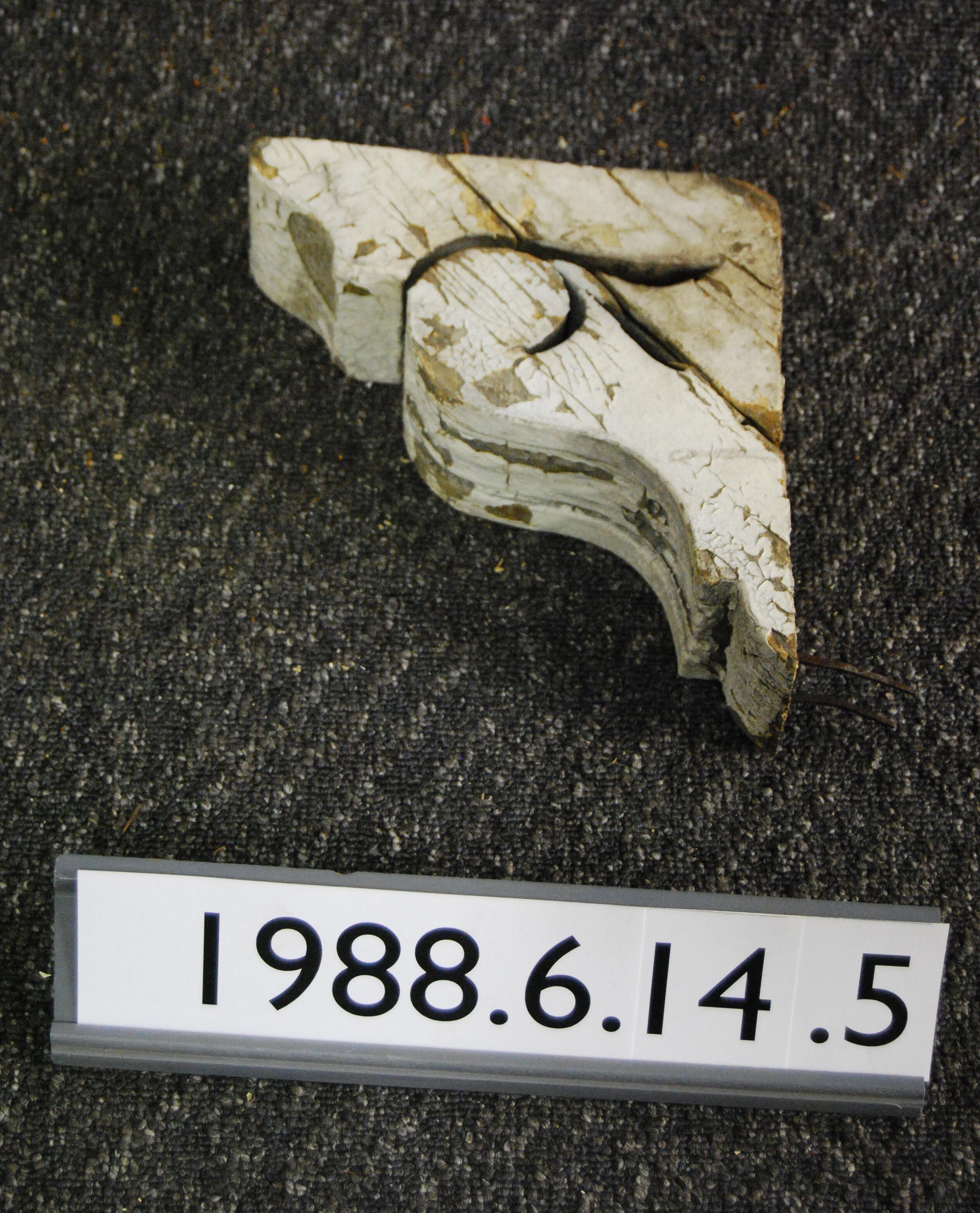 Wood bracket. Compound contour. Blunt / squarish protruding front end. Cracked lengthwise. Small piece missing (chip). Painted grey-white. Inscriptions or Markings: Manufacturer: Place of Manufacturer: Design motif: Style: Finish: Painted