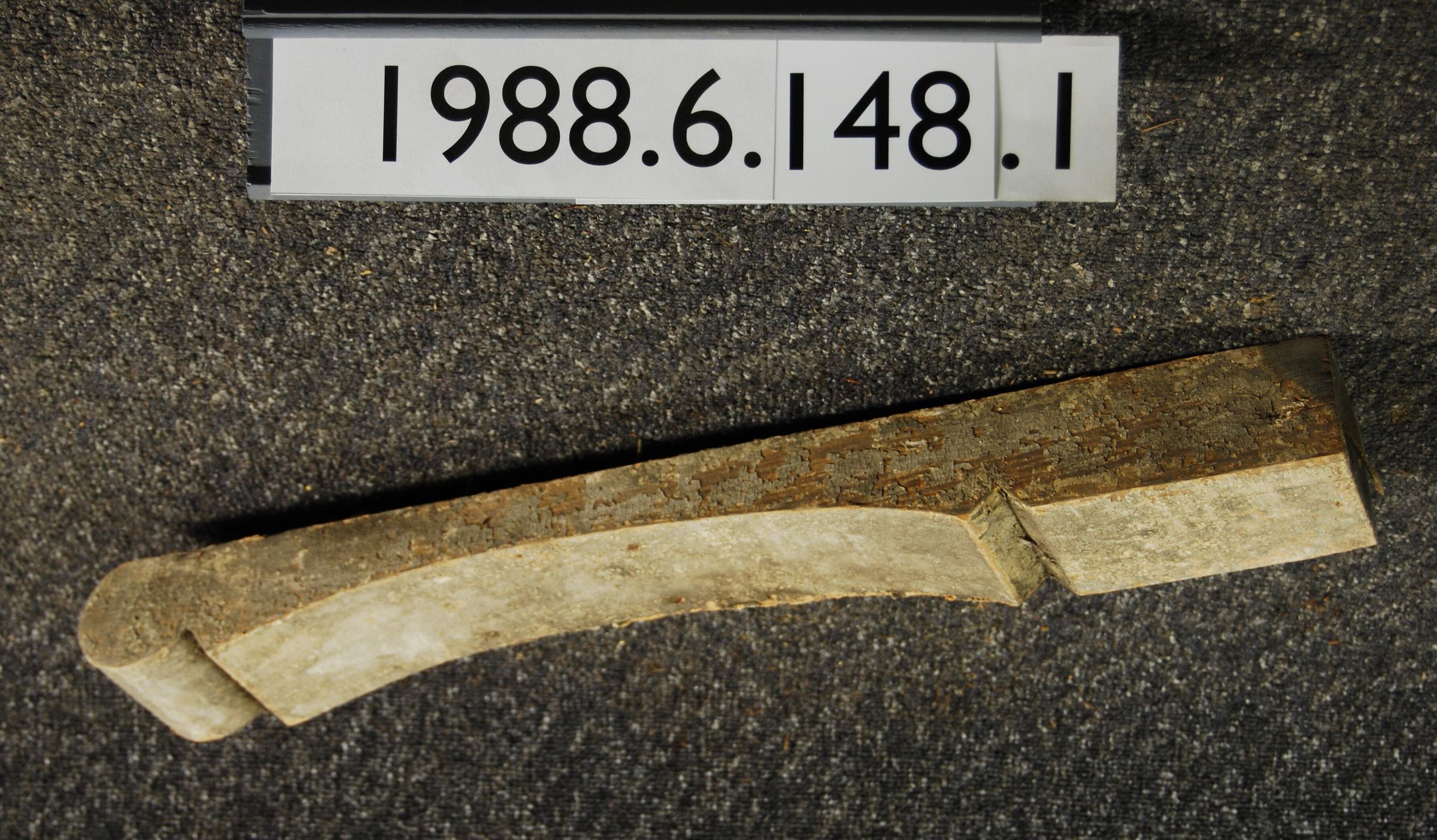 Wood bracket (rafter tail) Shallow concave shape. Rounded tip at front end. Squared at other end. Paint remnants. Inscriptions or Markings: Manufacturer: Place of Manufacturer: Design motif: Style: Finish: Painted