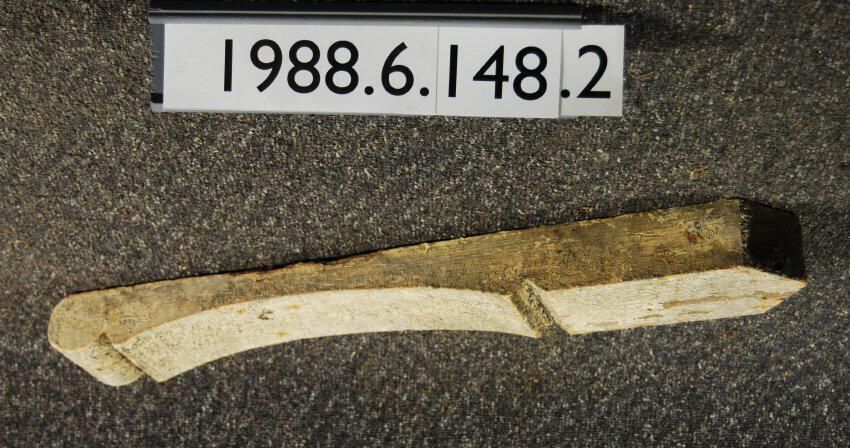 Wood bracket (rafter tail) Shallow concave shape. Rounded tip at front end. Angled at other end. Paint remnants. Inscriptions or Markings: Manufacturer: Place of Manufacturer: Design motif: Style: Finish: Painted