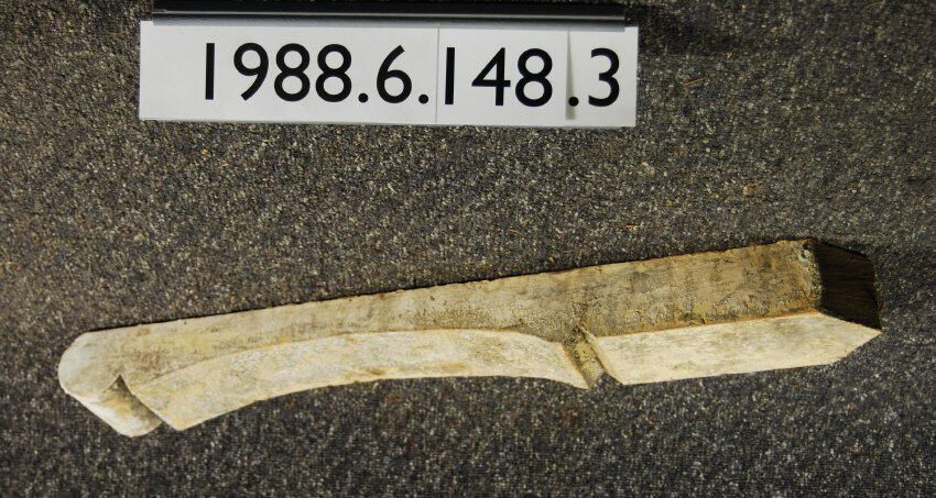 Wood bracket (rafter tail) Shallow concave shape. Rounded tip at front end. Angled at other end. Paint remnants. Inscriptions or Markings: Manufacturer: Place of Manufacturer: Design motif: Style: Finish: Painted