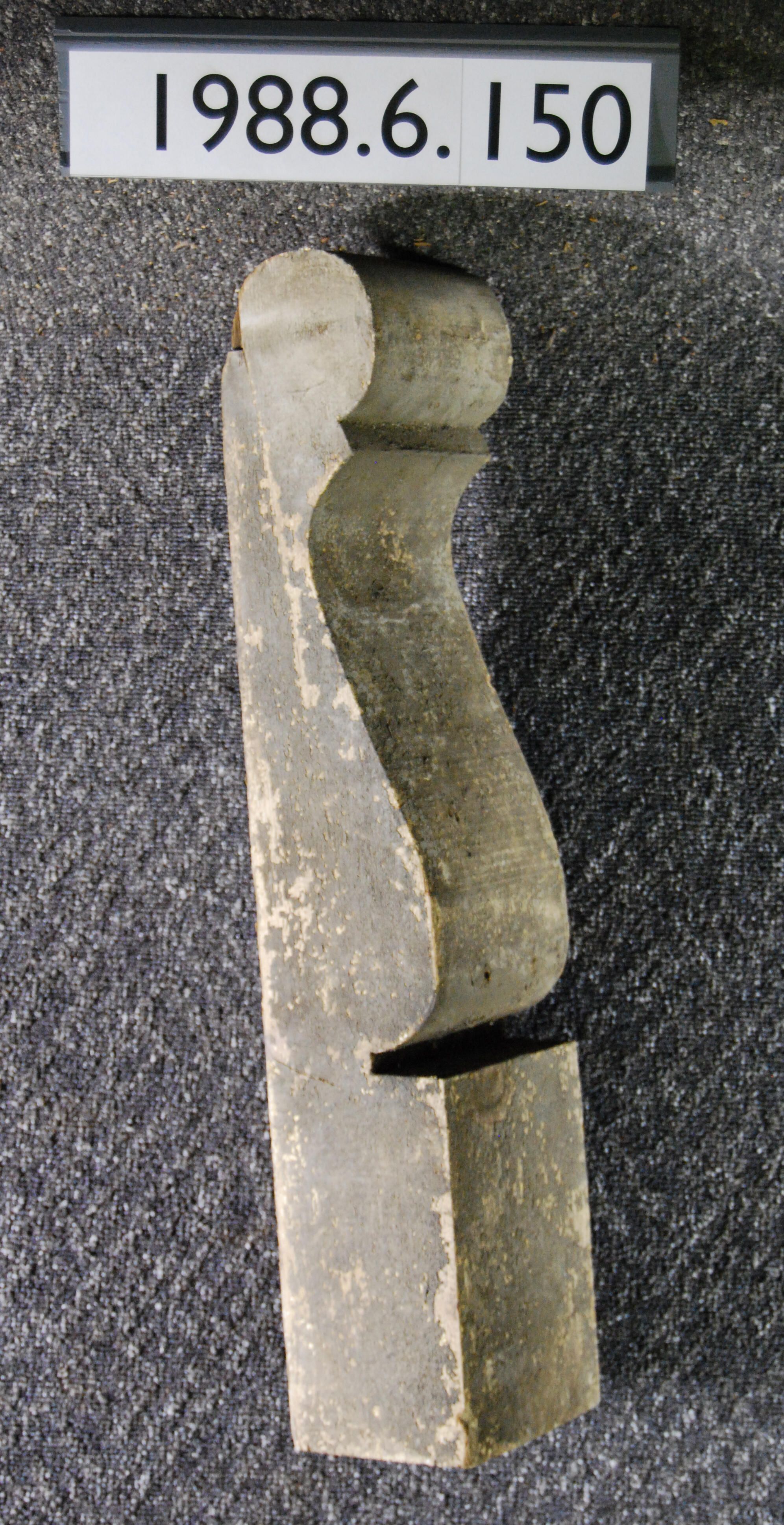 Wood bracket. . Compound contour. Rounded end. Greyish-brown paint remnants.. Inscriptions or Markings: Manufacturer: Place of Manufacturer: Design motif: Style: Finish: Painted