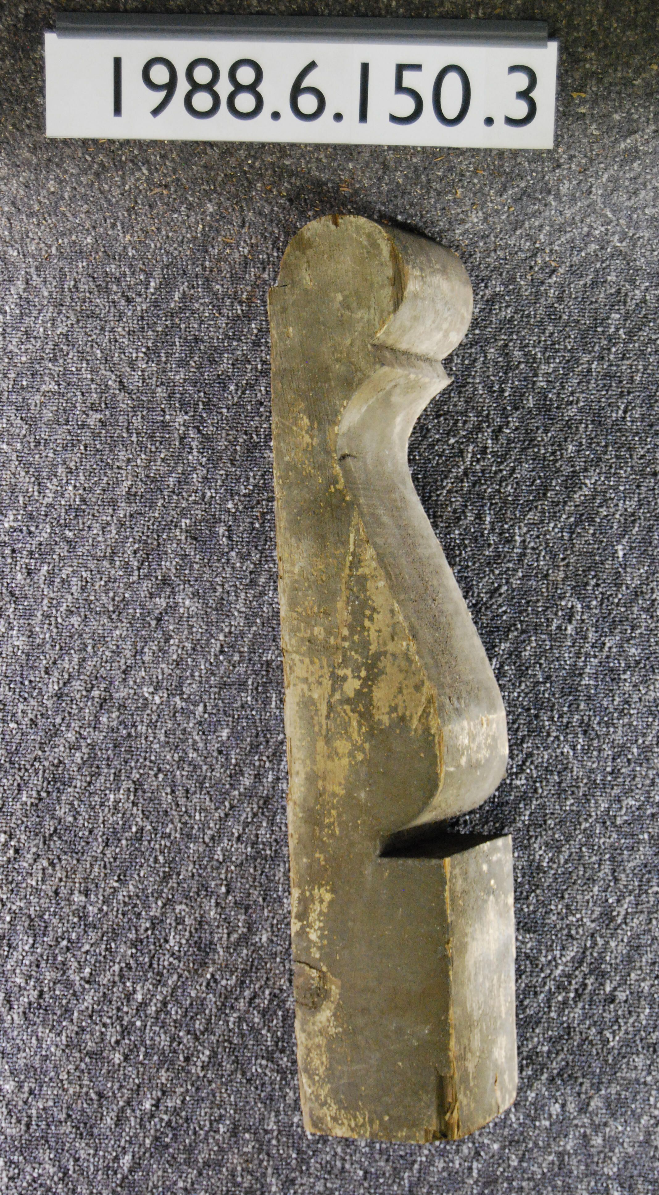 Wood bracket. Compound contour. Rounded end. Greyish-brown paint remnants.. Inscriptions or Markings: Manufacturer: Place of Manufacturer: Design motif: Style: Finish: Painted