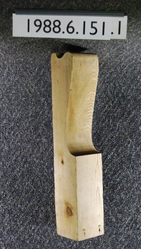 Wood bracket (rafter tail) Compound contour. Stripped of paint. Inscriptions or Markings: Manufacturer: Place of Manufacturer: Design motif: Style: Finish: Stripped