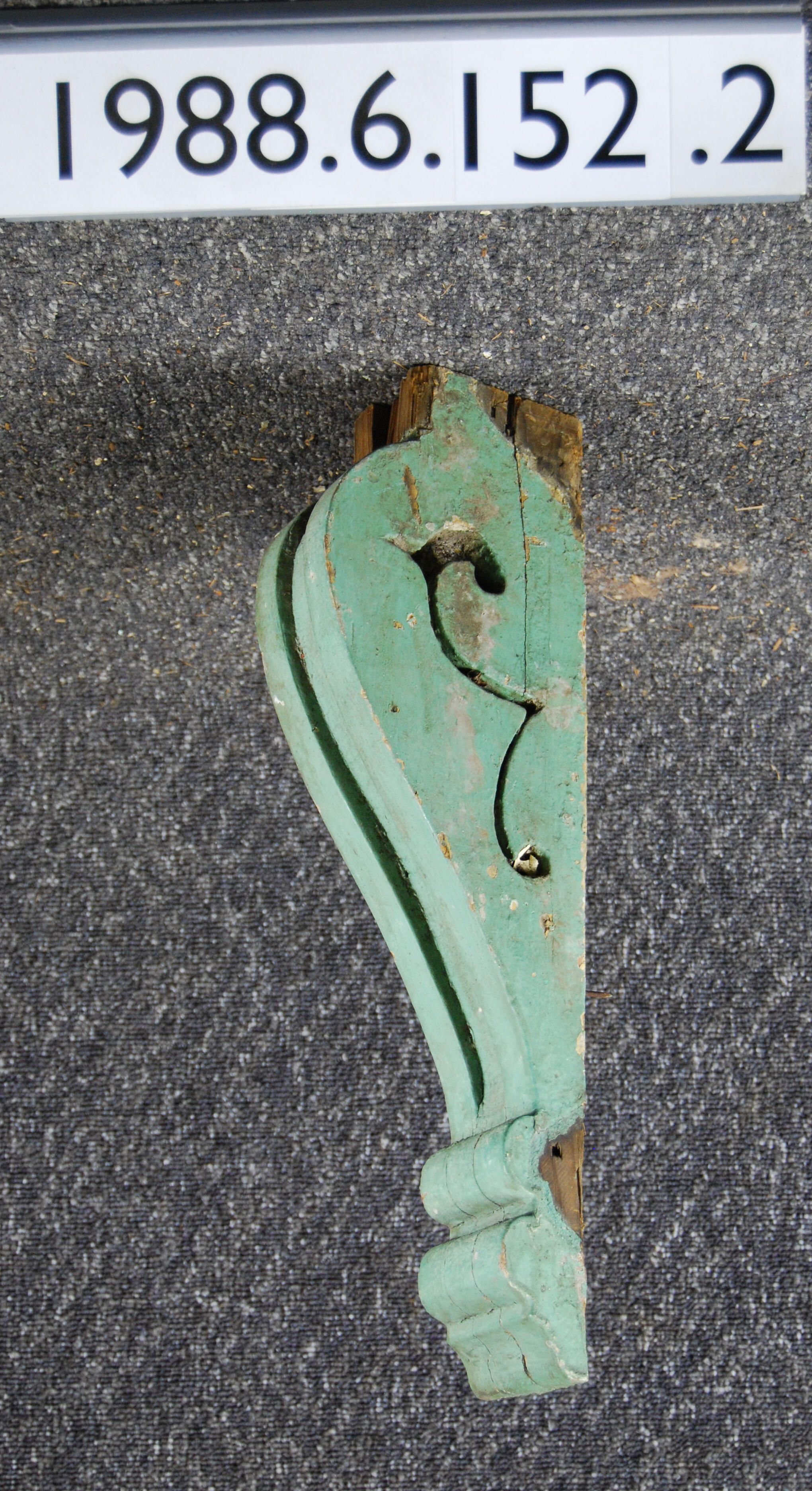 Wood bracket. Scrolled sides. Compound contour. Painted green. Inscriptions or Markings: Manufacturer: Place of Manufacturer: Design motif: Style: Finish: Painted