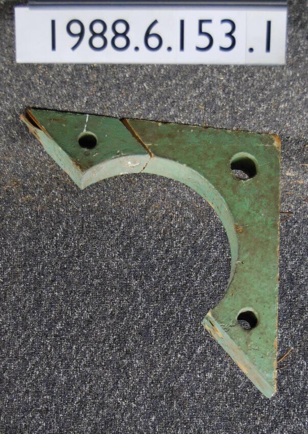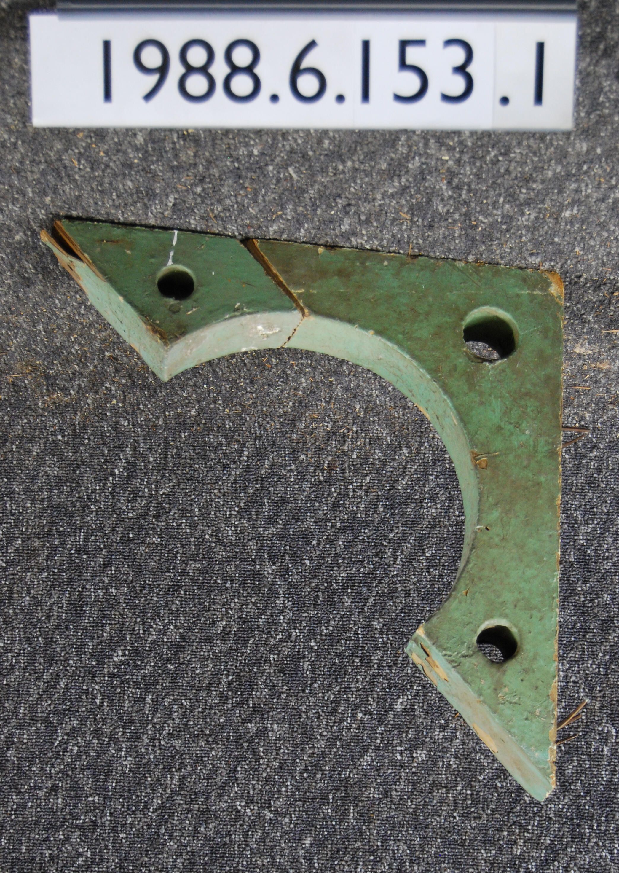Wood bracket. Curved profle with decorative holes. (Broken). Painted green. Inscriptions or Markings: Manufacturer: Place of Manufacturer: Design motif: Style: Finish: Painted