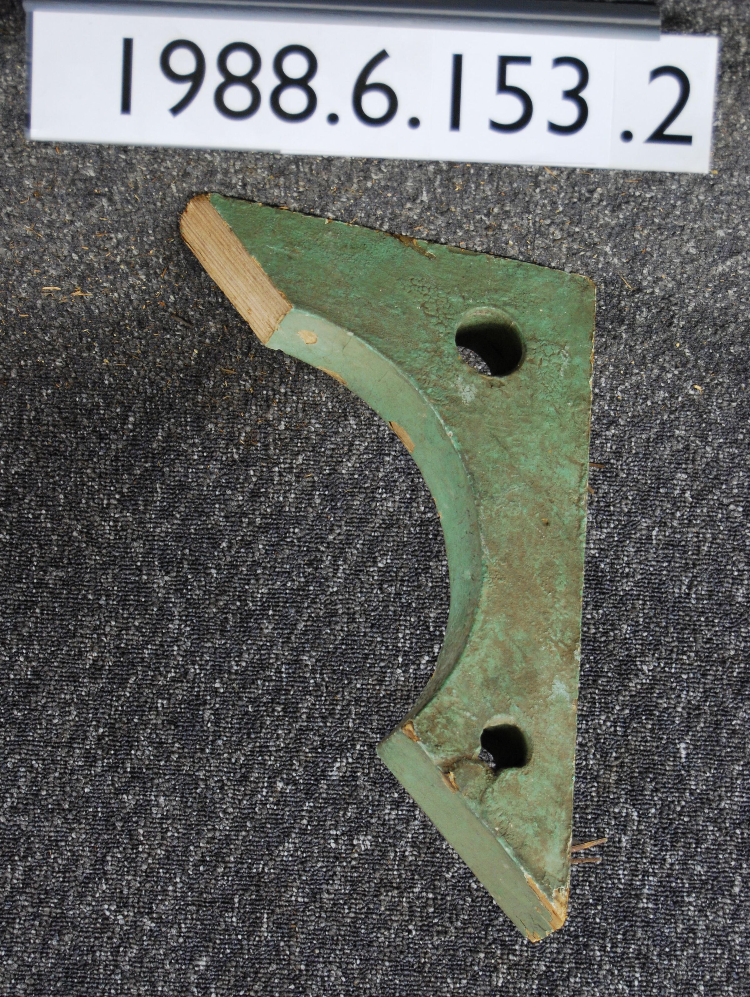 Wood bracket. Curved profle with decorative holes, incomplete (Broken). Painted green. Inscriptions or Markings: Manufacturer: Place of Manufacturer: Design motif: Style: Finish: Painted