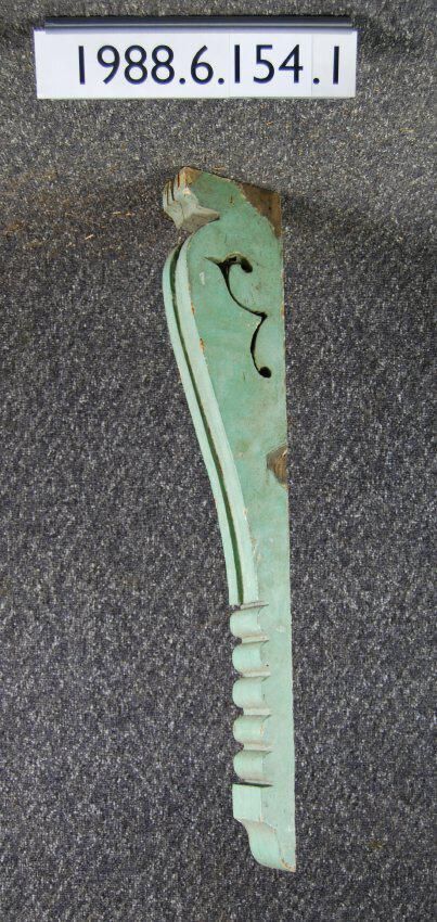 Wood bracket. Scrolled sides. Compound contour. Painted green. Inscriptions or Markings: Manufacturer: Place of Manufacturer: Design motif: Style: Finish: Painted