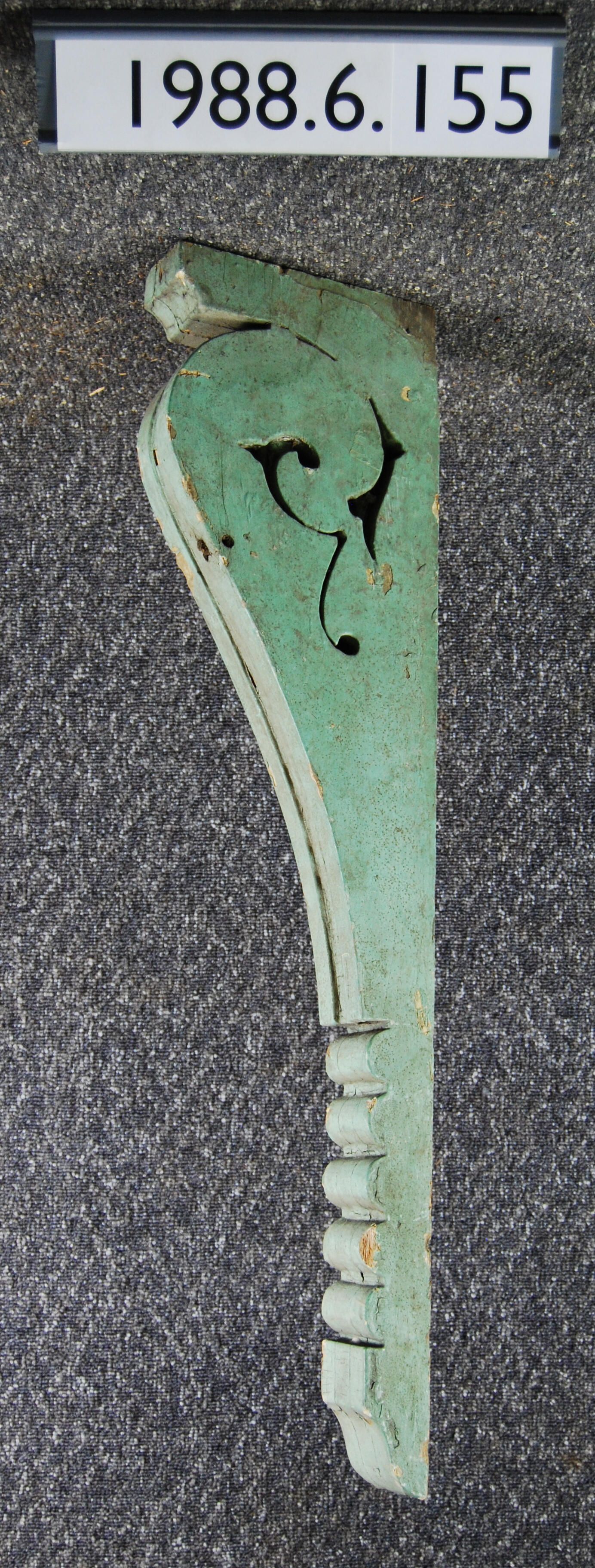 Wood bracket. Scrolled sides. Compound contour. Painted green. Inscriptions or Markings: Manufacturer: Place of Manufacturer: Design motif: Style: Finish: Painted