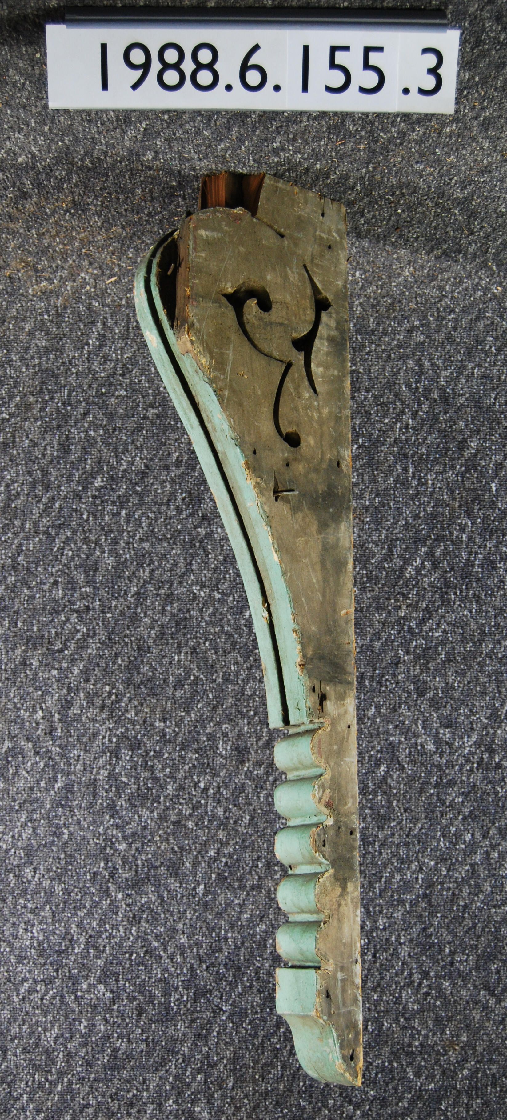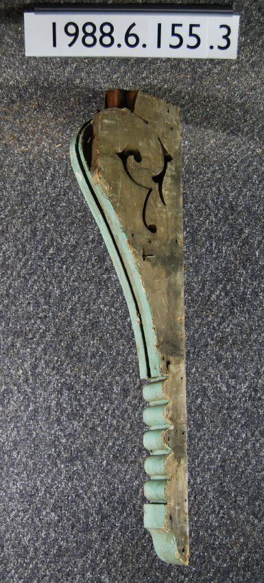 Wood bracket. Scrolled sides. Compound contour. Painted green. Inscriptions or Markings: Manufacturer: Place of Manufacturer: Design motif: Style: Finish: Painted